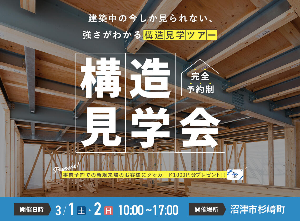 構造見学会は、既に完成しているモデルハウス見学とは違ったポイントで、よりリアルな家づくりを体感していただける貴重なイベントです!