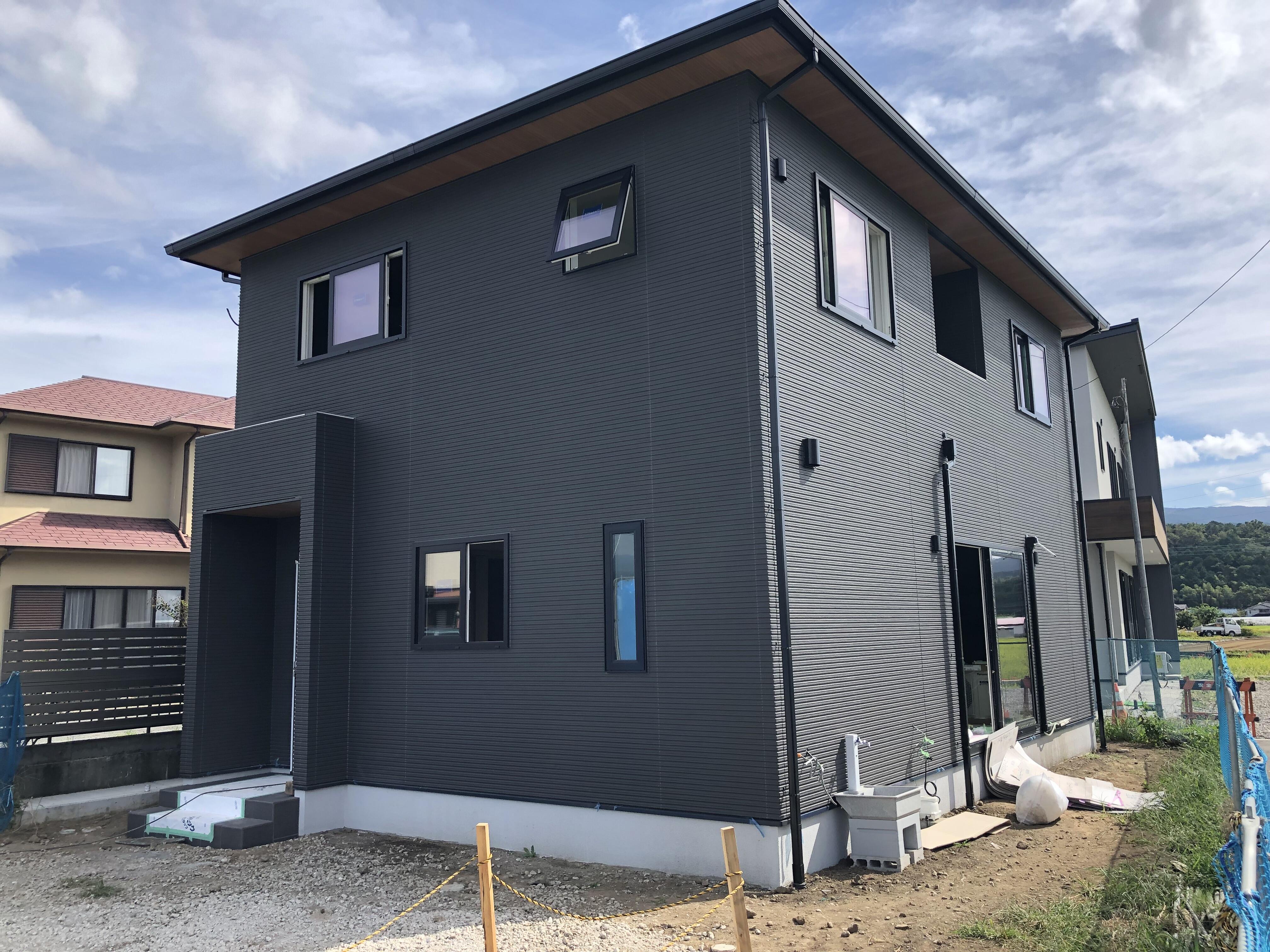外壁はブラックに木目の軒天と玄関でスタイリッシュな外観に。