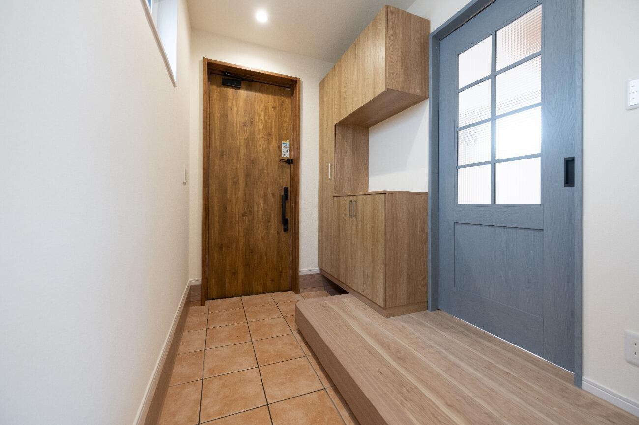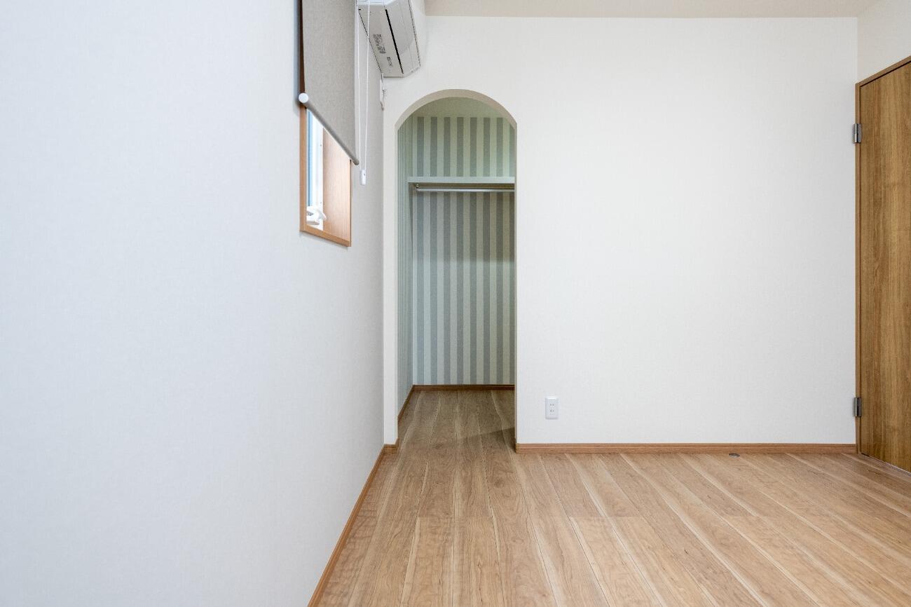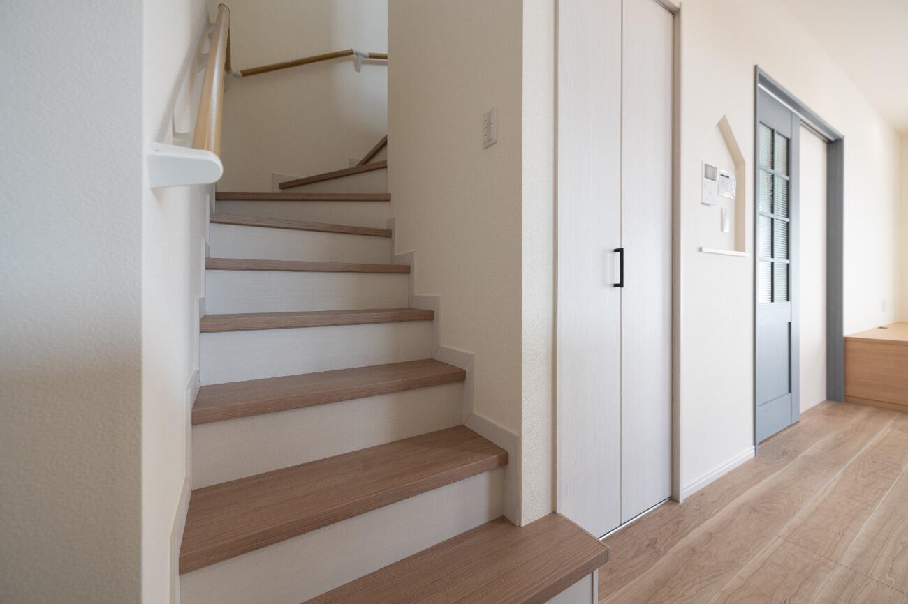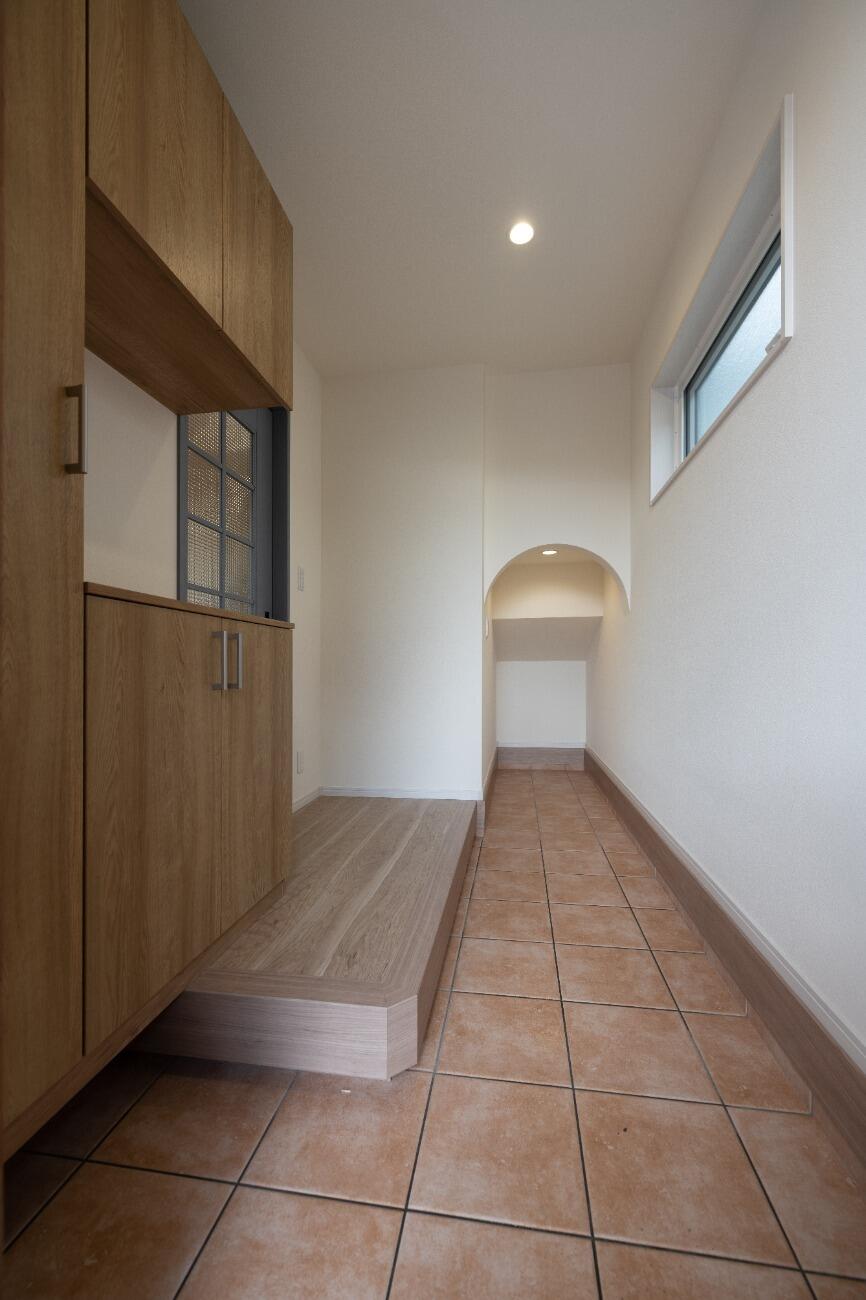 玄関ホールに向かって左右に広い玄関は、圧迫感を感じません。階段下部にあたる奥部も収納スペースに。自転車収納も可能。アーチ型の垂れ壁でかわいいデザインにしました。