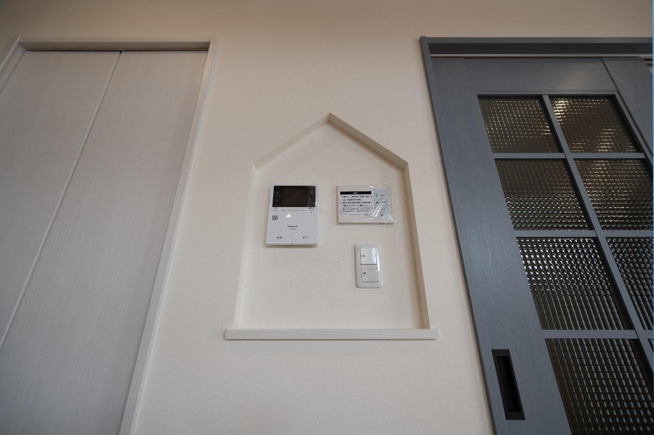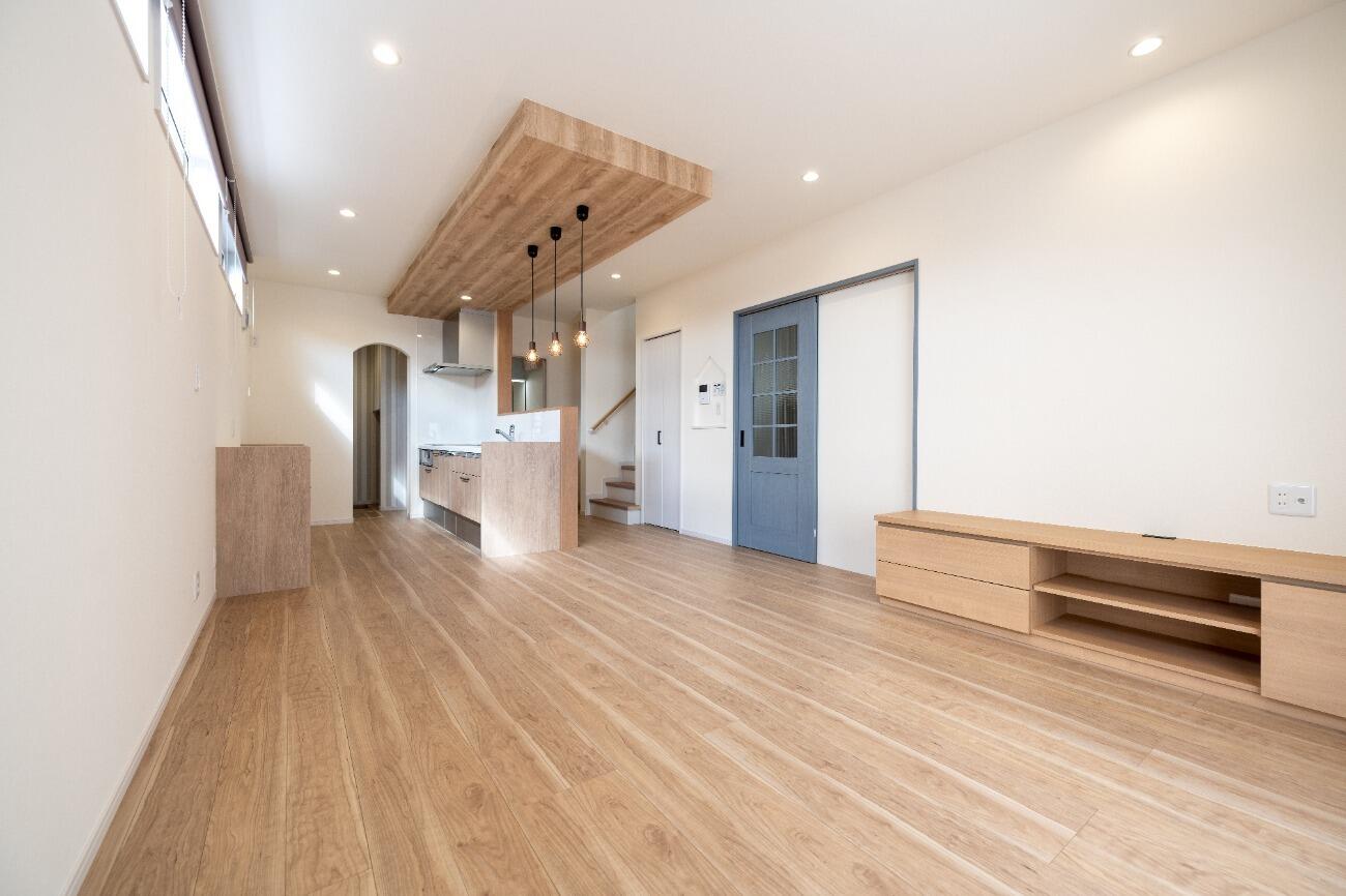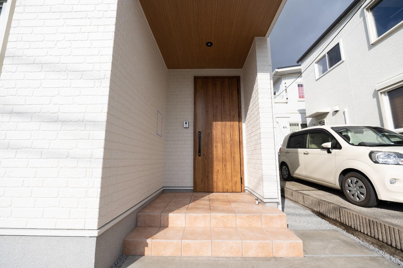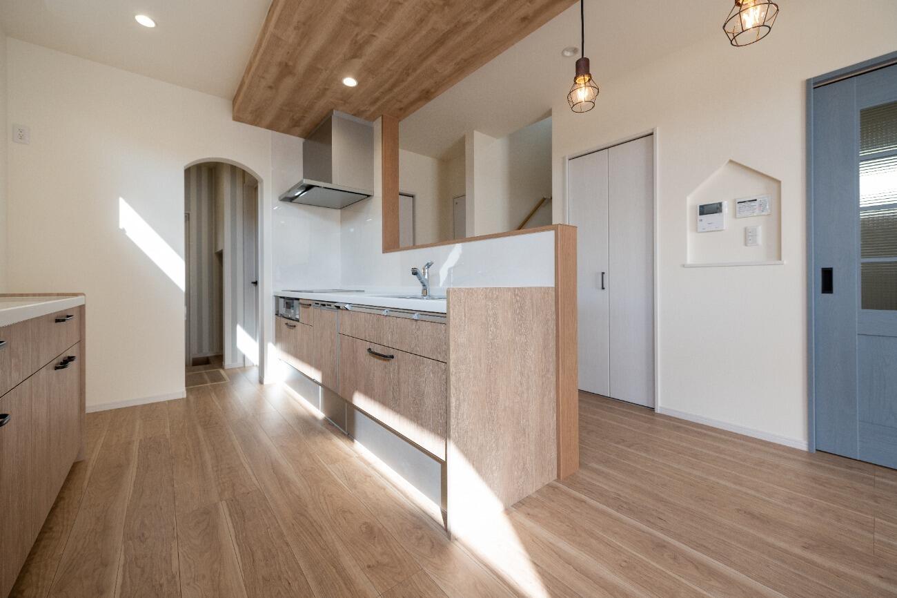 玄関ホールに向かって左右に広い玄関は、圧迫感を感じません。階段下部にあたる奥部も収納スペースに。自転車収納も可能。アーチ型の垂れ壁でかわいいデザインにしました。