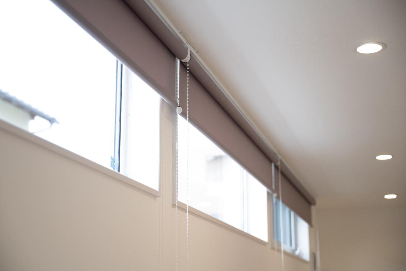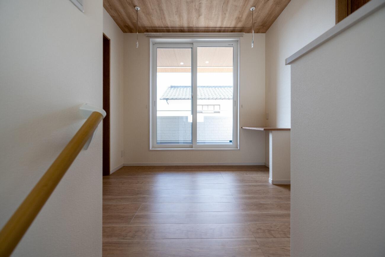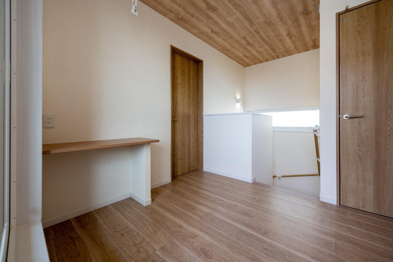 階段上った2階ホール一角にカウンターを設け、天井にはホスクリーンをつけました。 カウンターでは洗濯を物を畳むこともできたり、アイロン掛けもできます。 掃出し窓からそのまま外に洗濯物を外に出すことができ、家事動線もバッチリです!