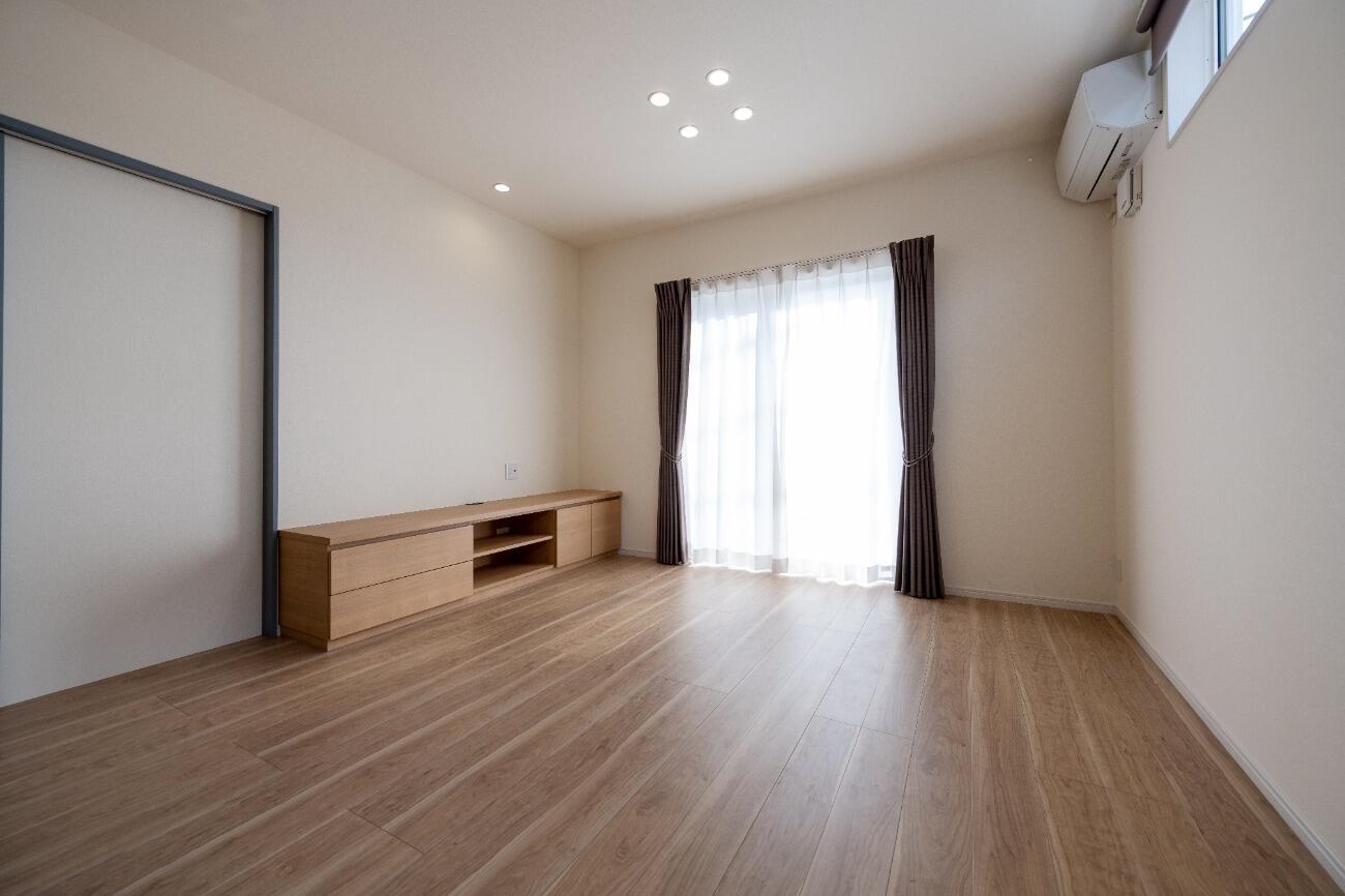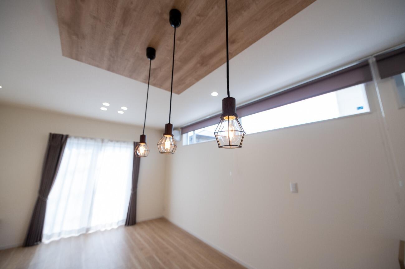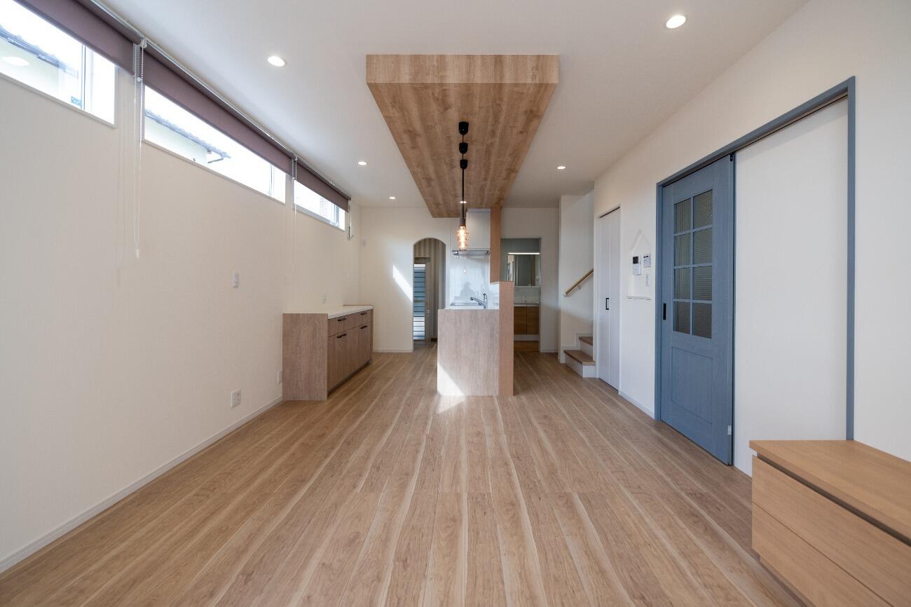 階段上った2階ホール一角にカウンターを設け、天井にはホスクリーンをつけました。 カウンターでは洗濯を物を畳むこともできたり、アイロン掛けもできます。 掃出し窓からそのまま外に洗濯物を外に出すことができ、家事動線もバッチリです!