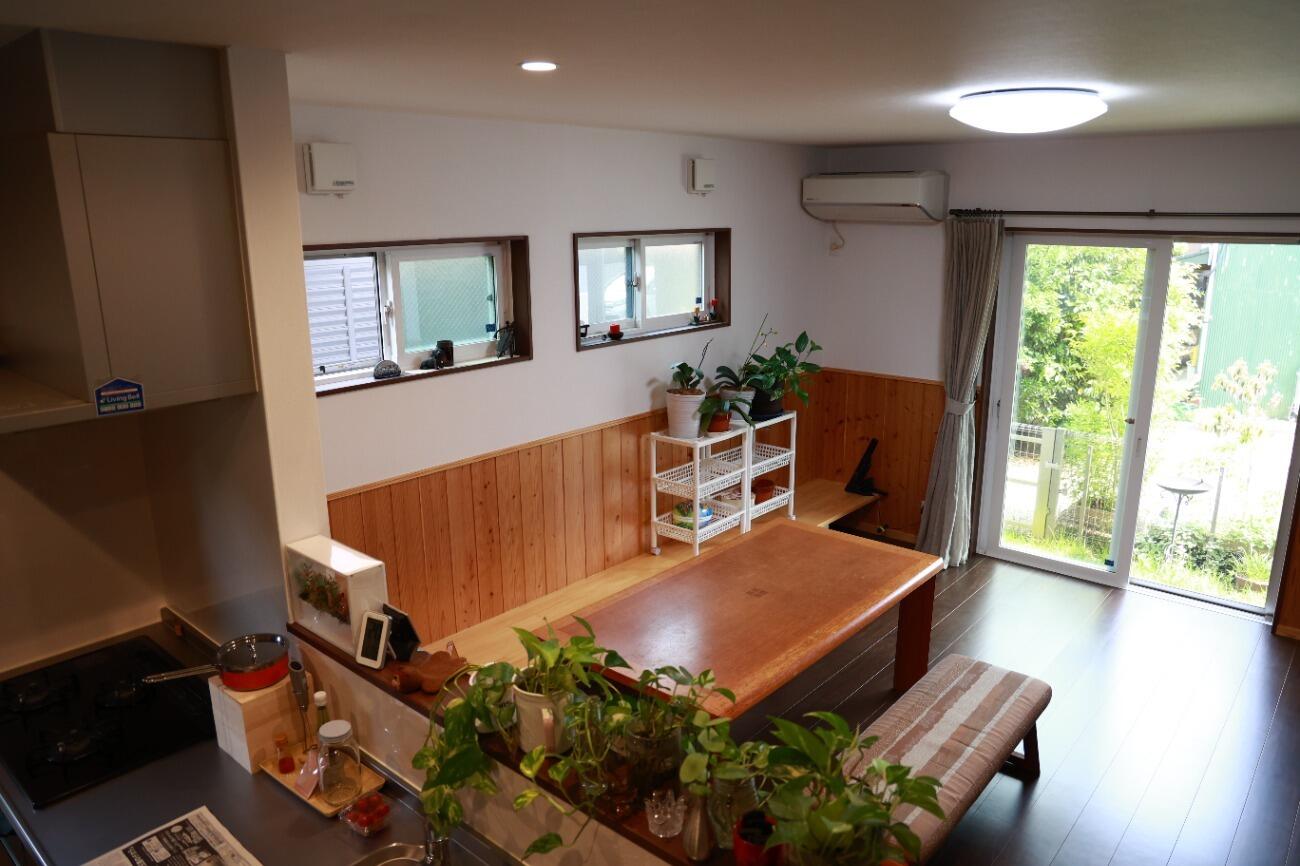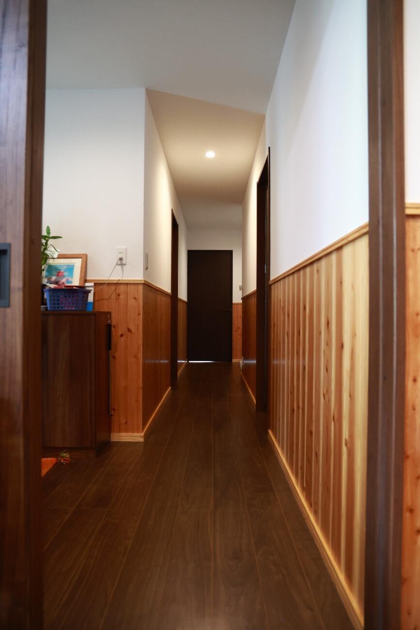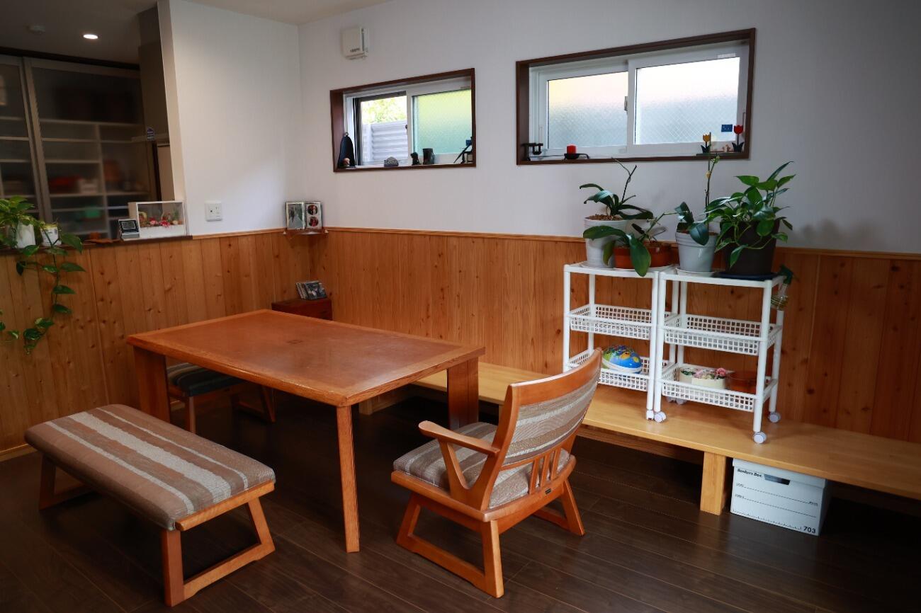 ヒノキ腰壁とホタテペイントでつくられたリビング。腰壁は壁の汚れやキズ防止になり、デザイン性もあります。ホタテペイントは人に優しく安全な壁材の上、消臭効果に加え、吸放湿性に優れ、快適に過ごすことができます。