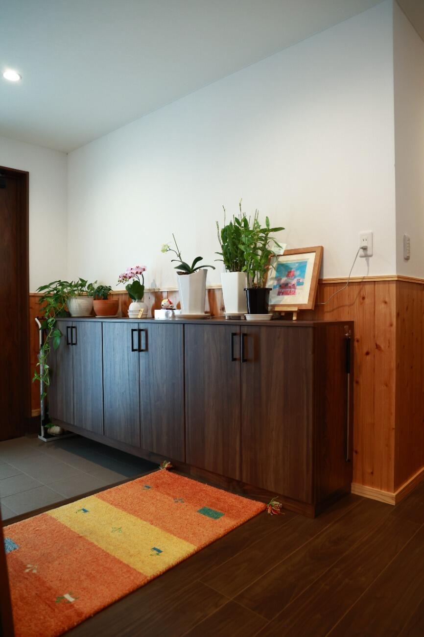 低めの玄関収納は圧迫感がなく、空間を広く感じさせてくれます。収納上にお好きなインテリアを飾って個性を出し、植物を飾ってフレッシュで爽やかな空間になっています。