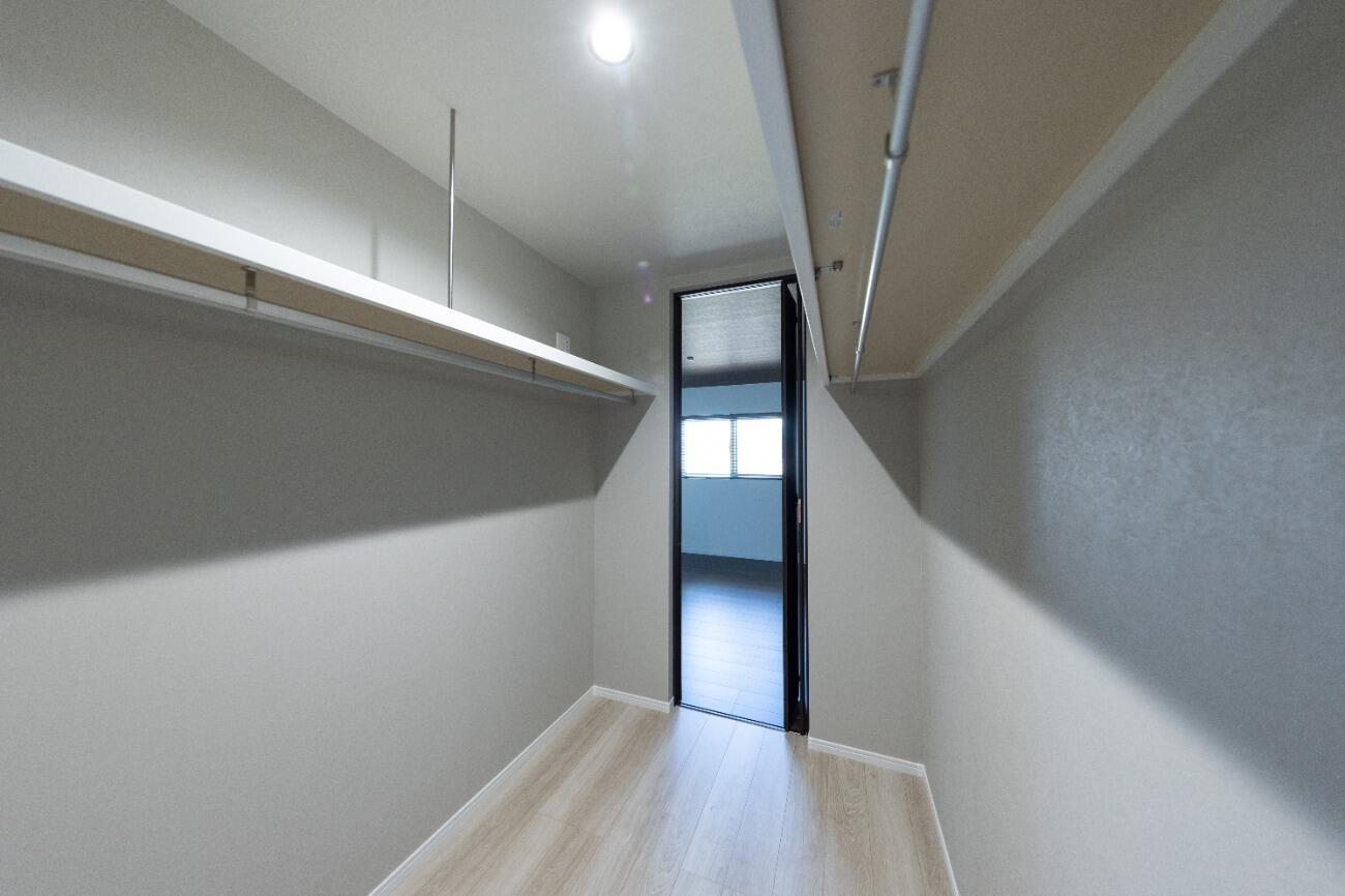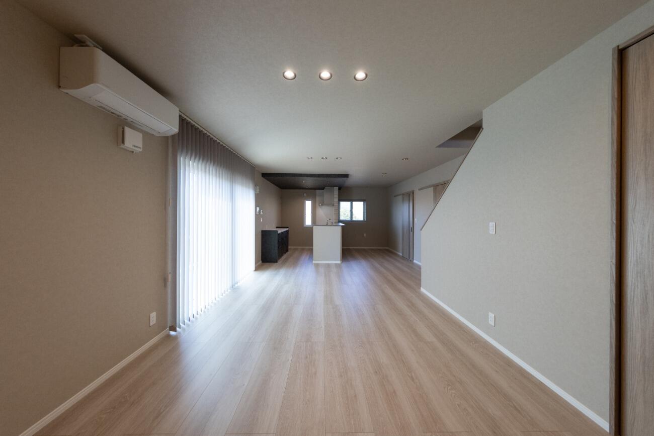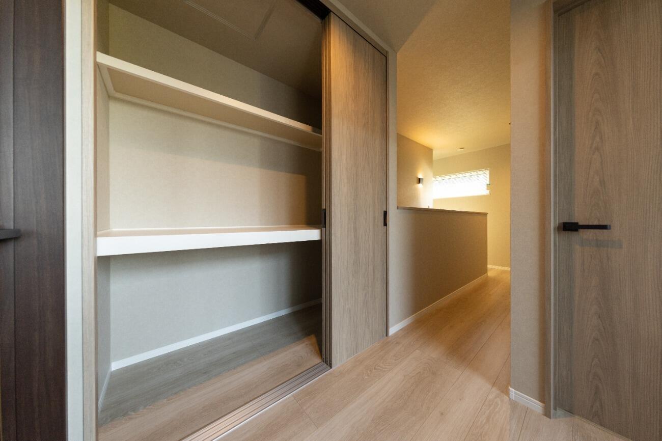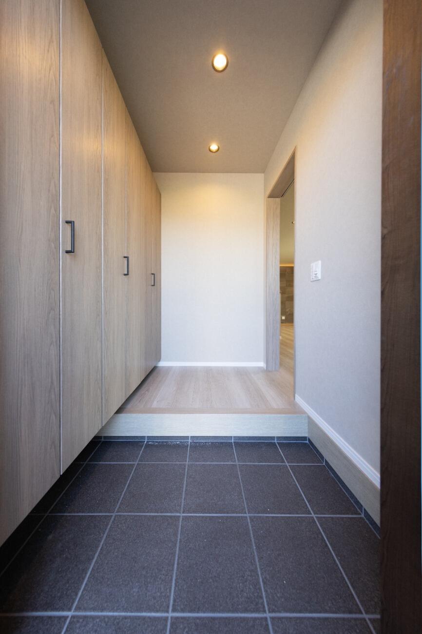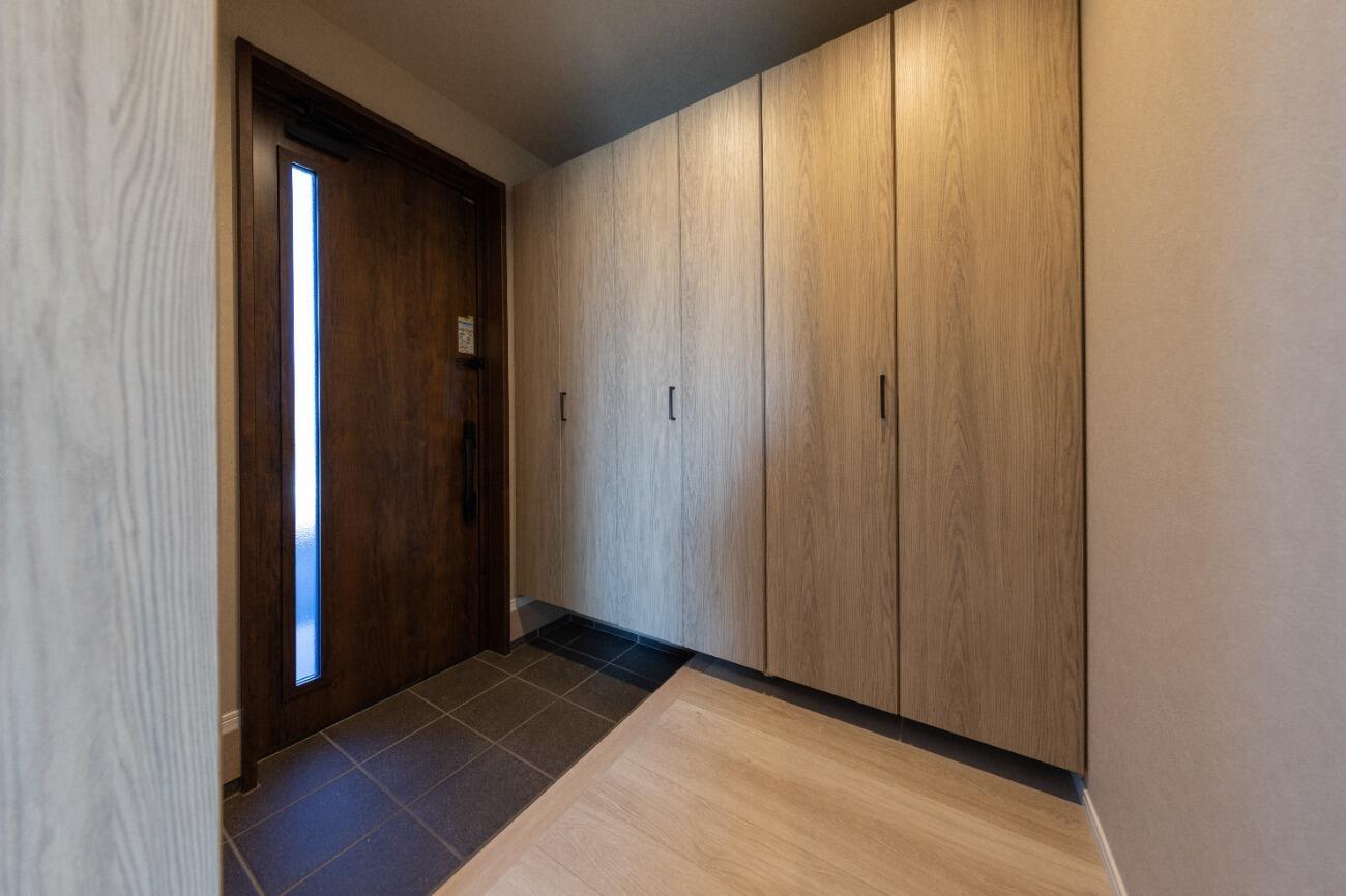 玄関入ると大きいたっぷり収納が現れます。土間収納もあり、靴収納もあり、アウトドア用品なども収納可能!全面に扉をつけ、隠す収納になっています。