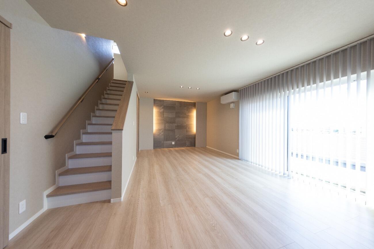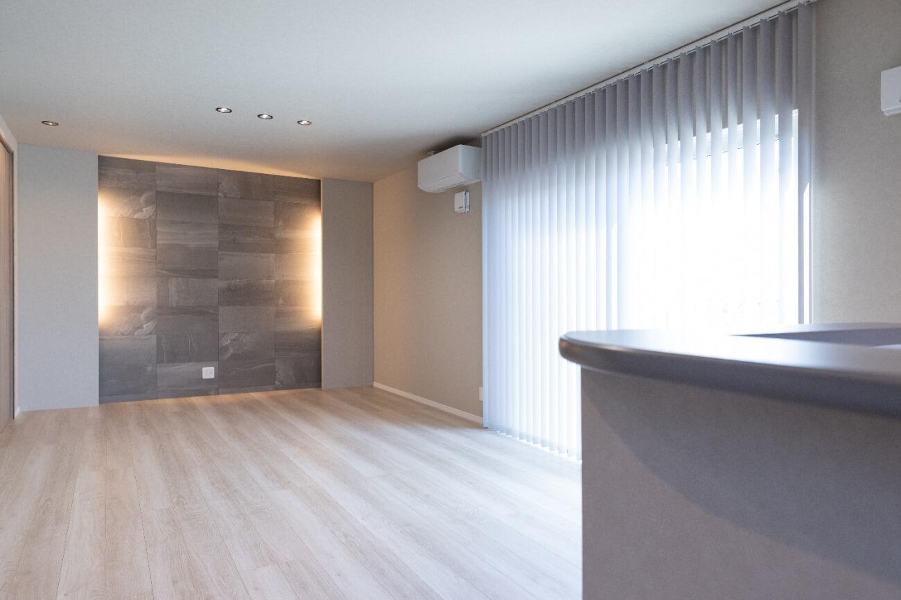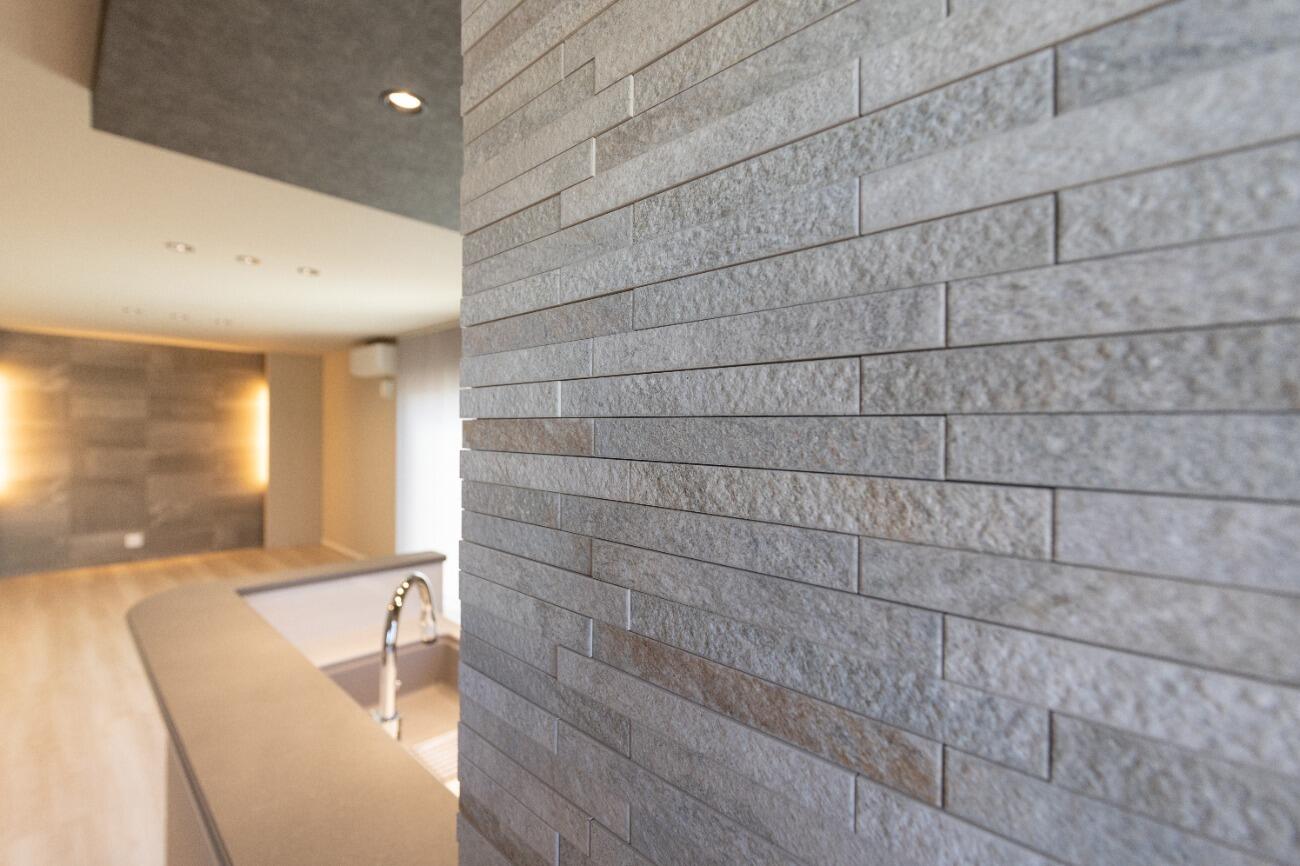 LDKのテレビ背面にグレーのエコカラットタイルを選びました。両側からの間接照明でタイルを照らすことでその表情は一段と引き立ちます。照明はおしゃれな空間を作る大事な要素です。