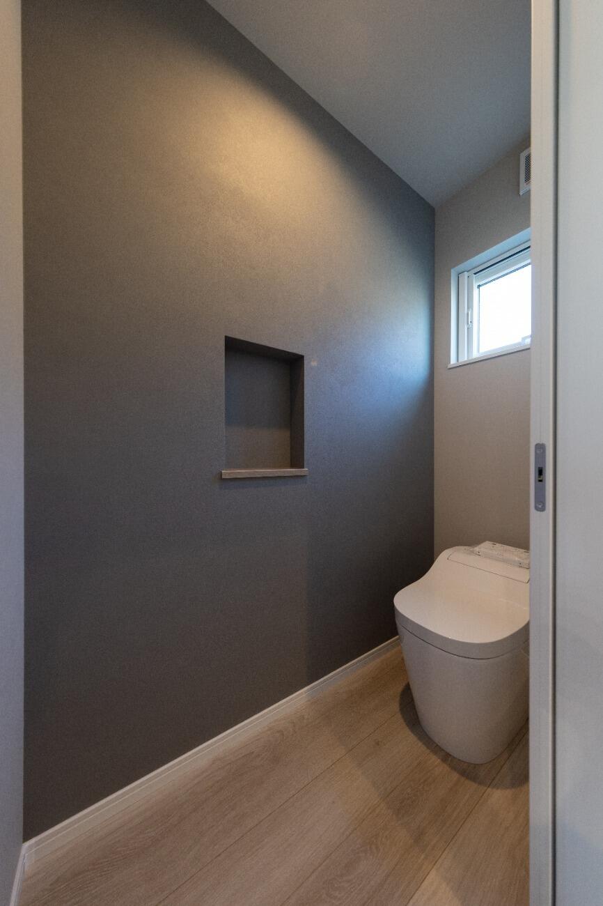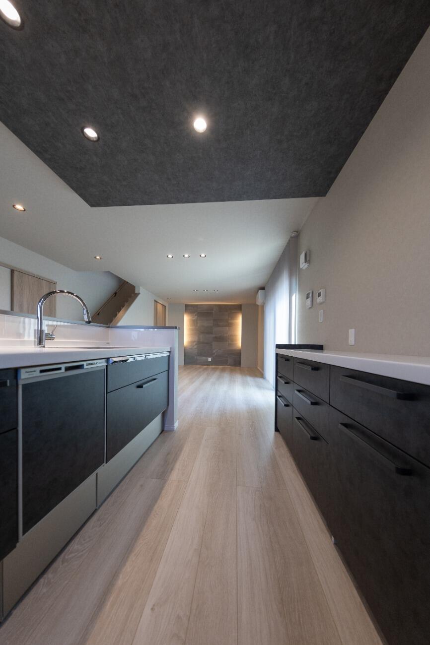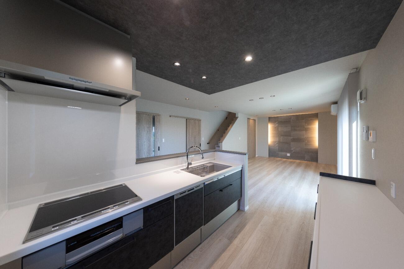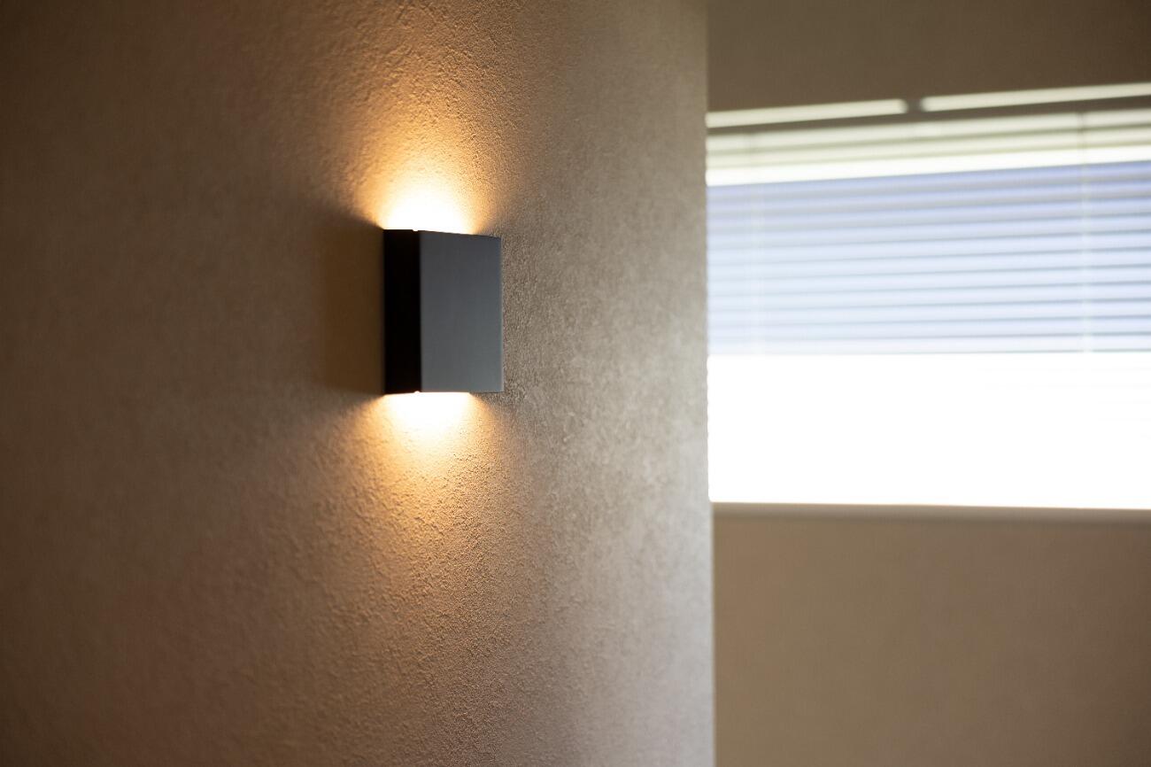 LDKのテレビ背面にグレーのエコカラットタイルを選びました。両側からの間接照明でタイルを照らすことでその表情は一段と引き立ちます。照明はおしゃれな空間を作る大事な要素です。