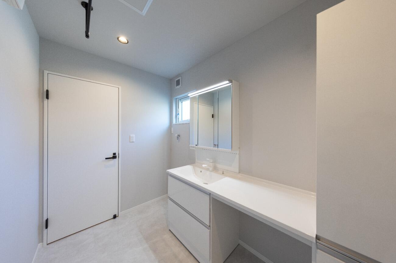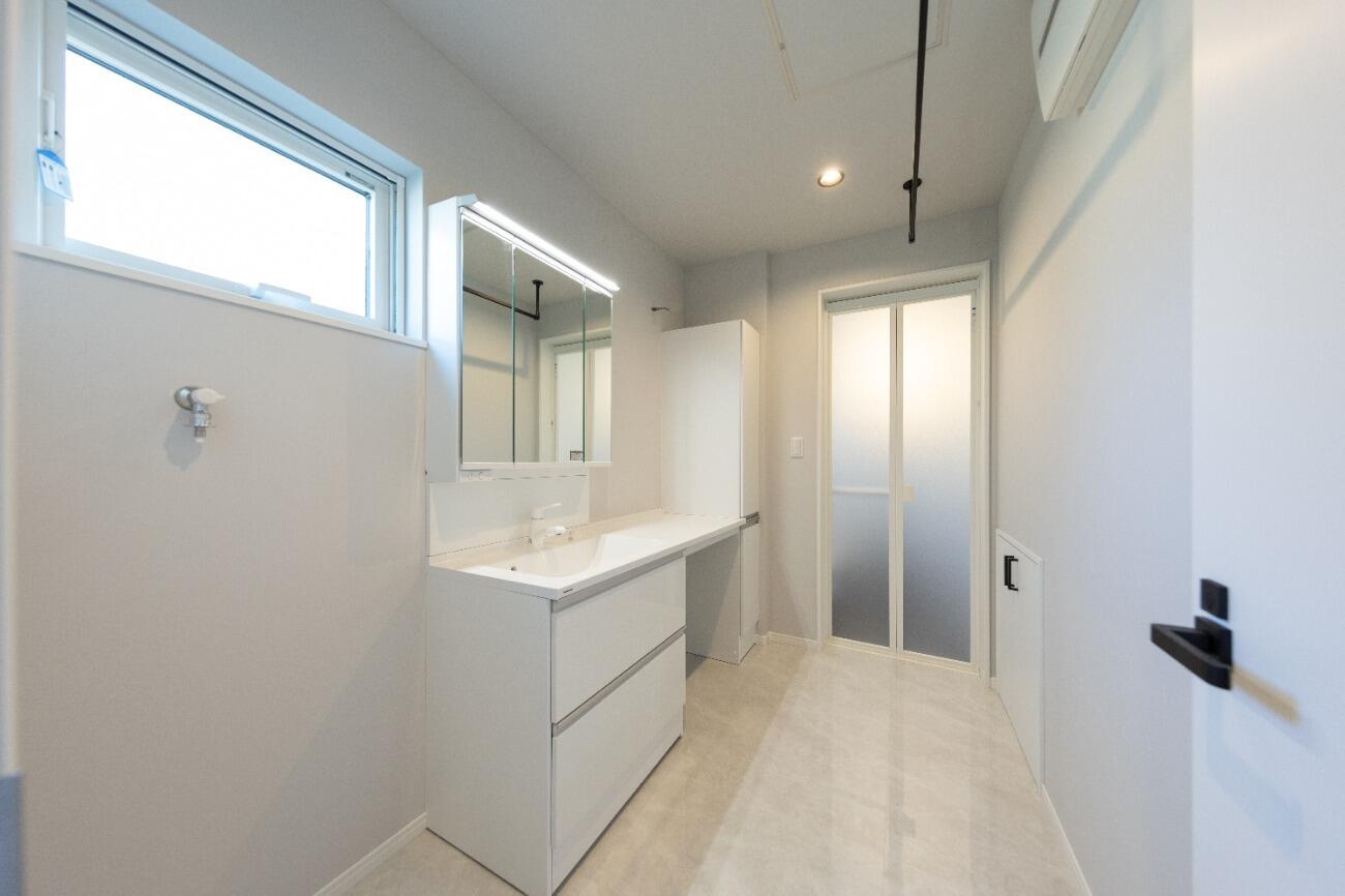 洗面はカウンターの大きい物をセレクト。椅子を置いてゆっくりとお顔のケアも可能。ホワイトでまとめ、清潔感のある空間に。上部にはハンギングバーを取付け、洗濯物もかけられる便利な空間になりました。