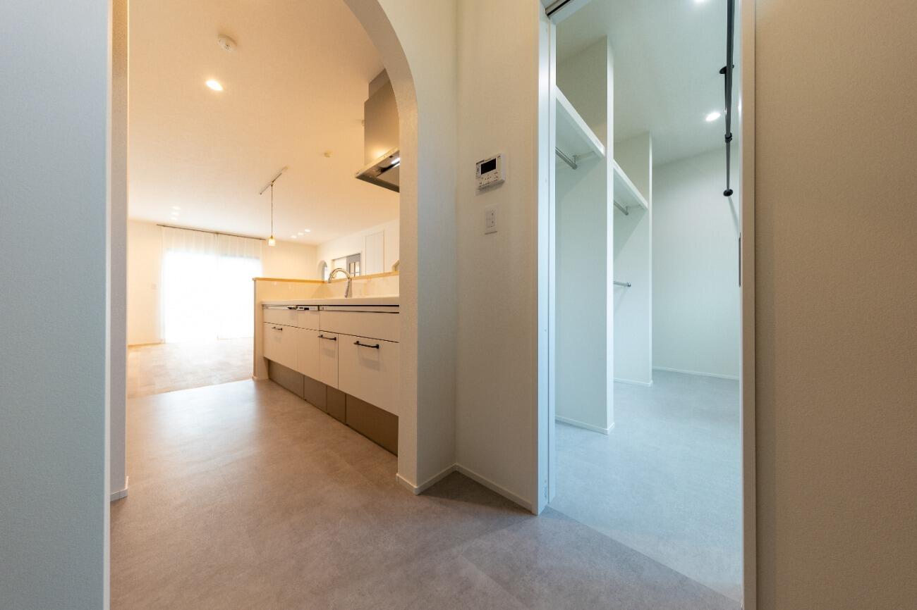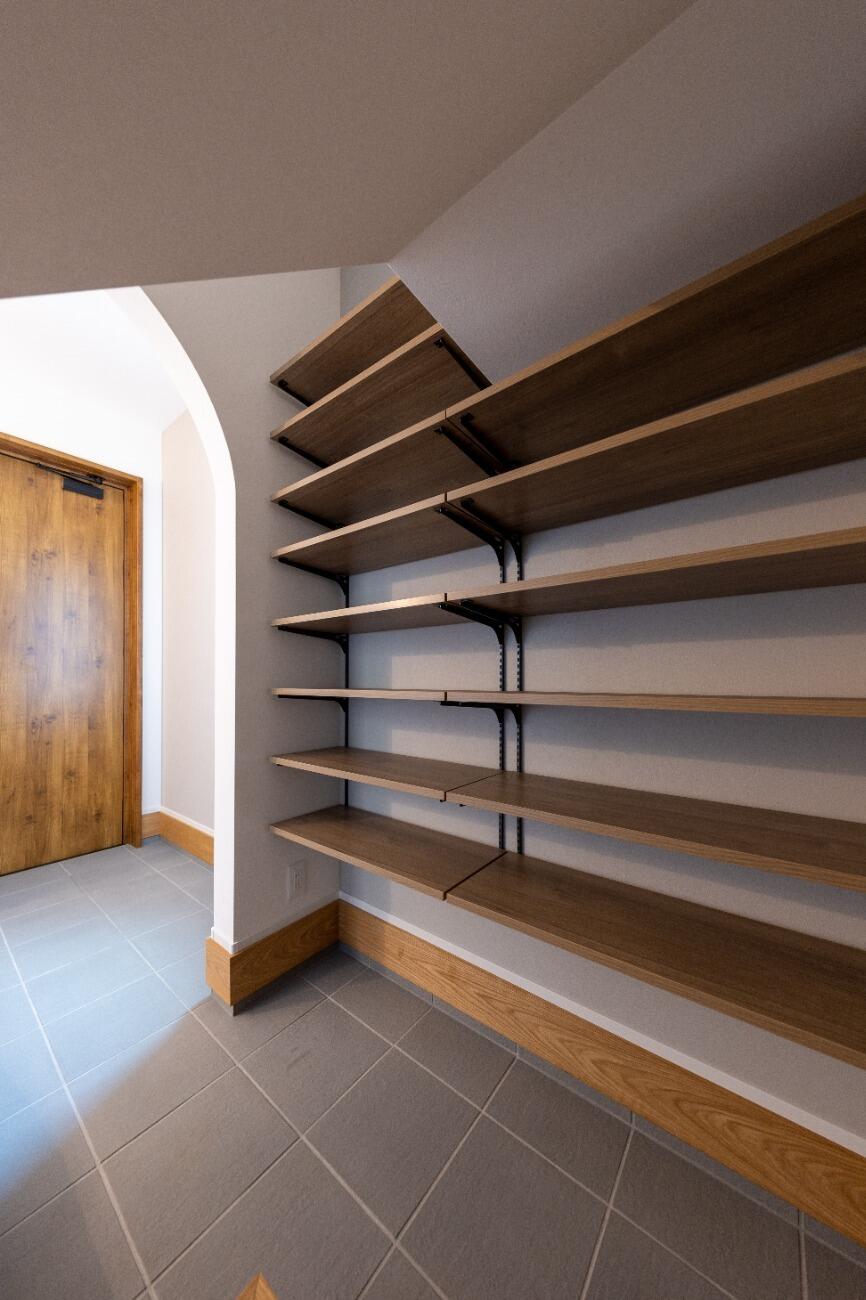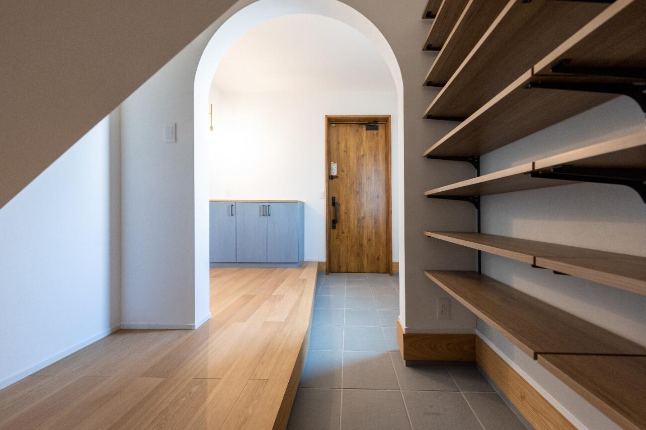 玄関を入るとかわいいアーチ型の壁がお出迎え。くぐったその先には、収納可動棚とコートハンガー。靴だけでなく、いろんなものの収納に役立ちそうです。