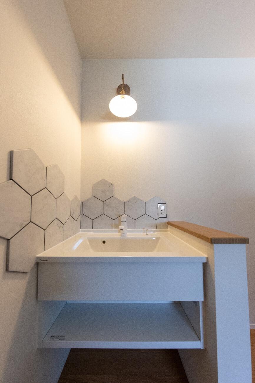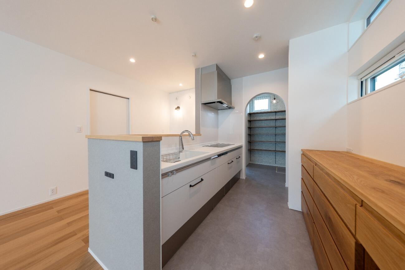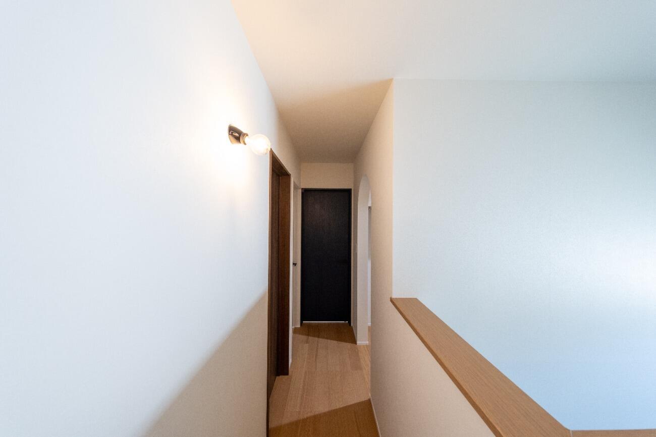 玄関を入るとかわいいアーチ型の壁がお出迎え。くぐったその先には、収納可動棚とコートハンガー。靴だけでなく、いろんなものの収納に役立ちそうです。