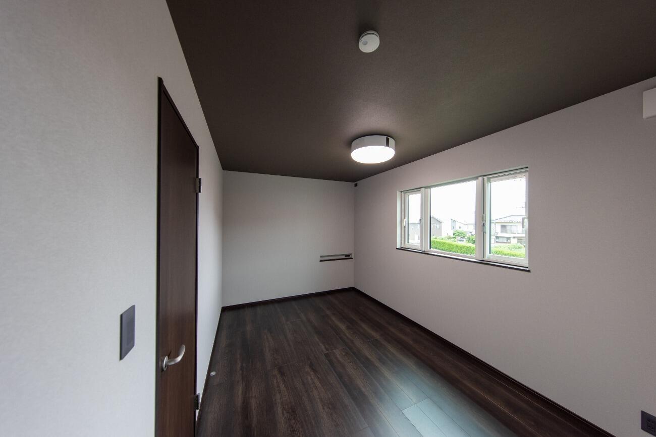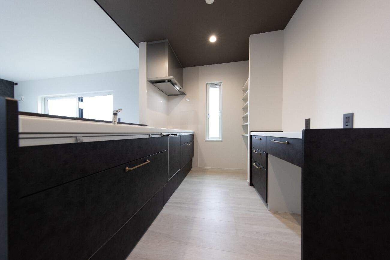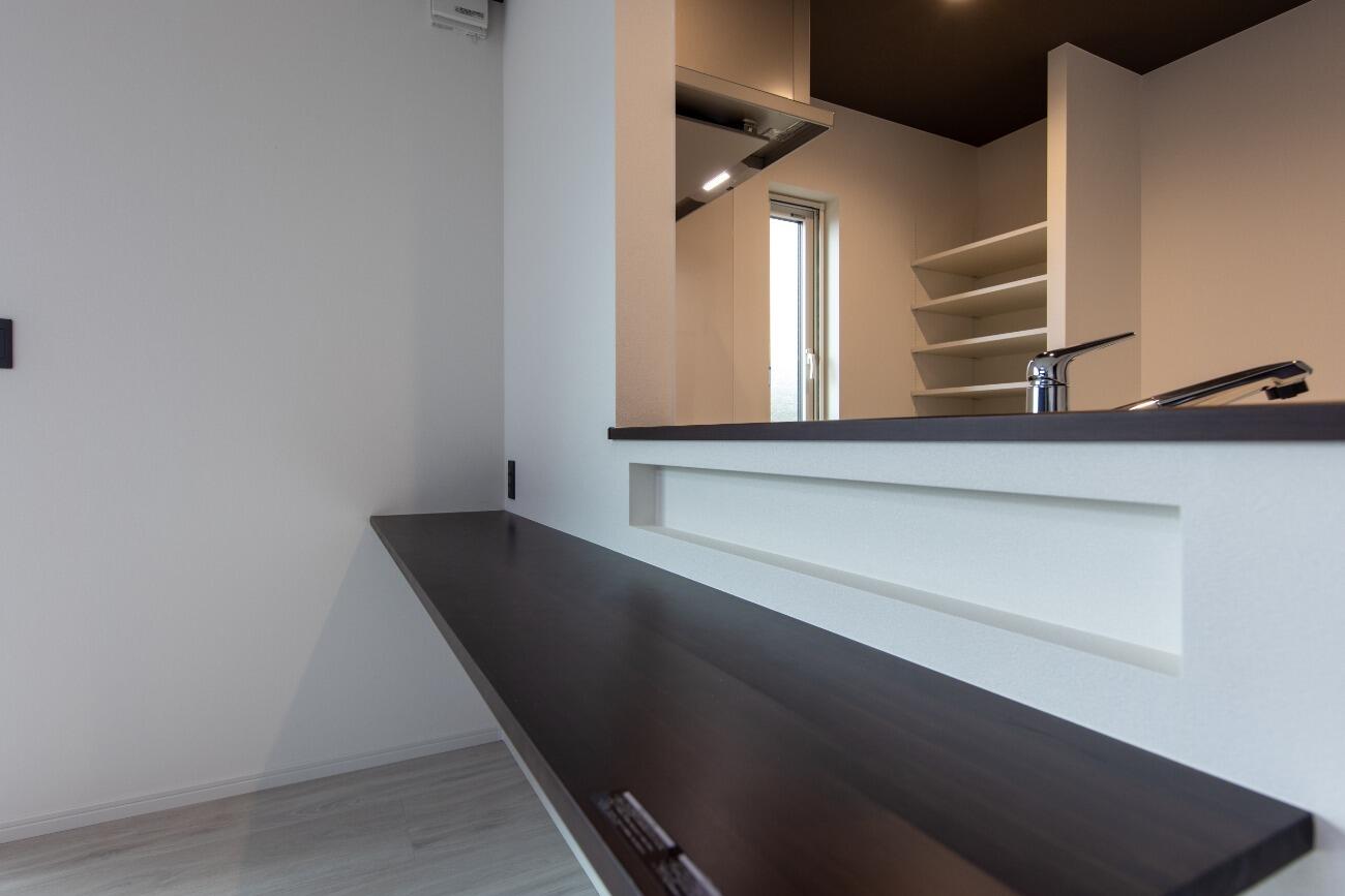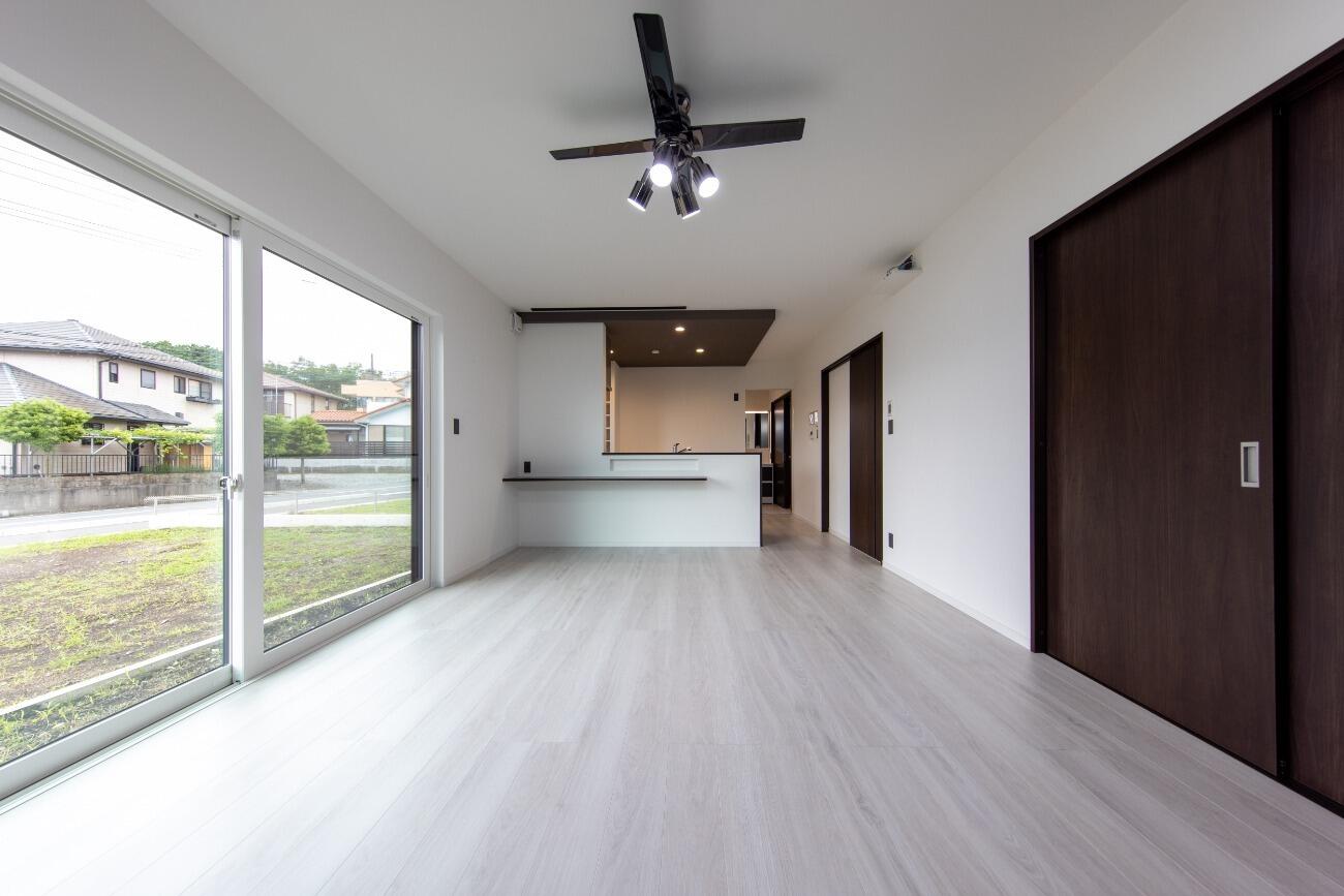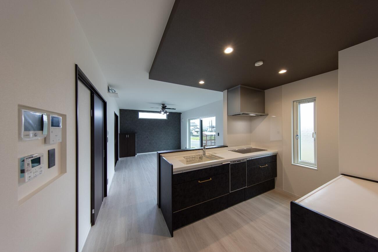 建具、アクセントクロス、設備扉を濃いカラーでまとめ、しっとり落ち着いたLDKに。
