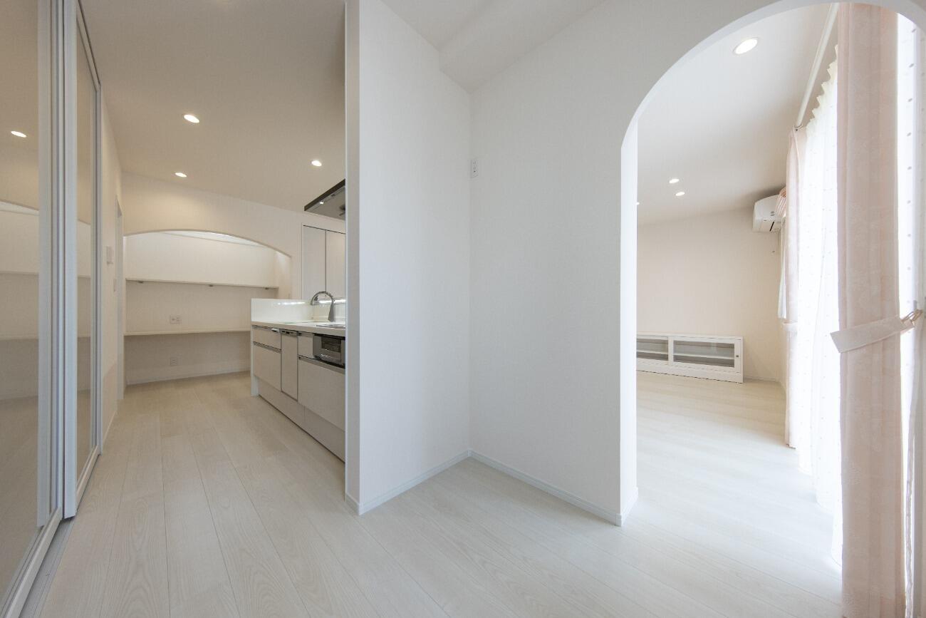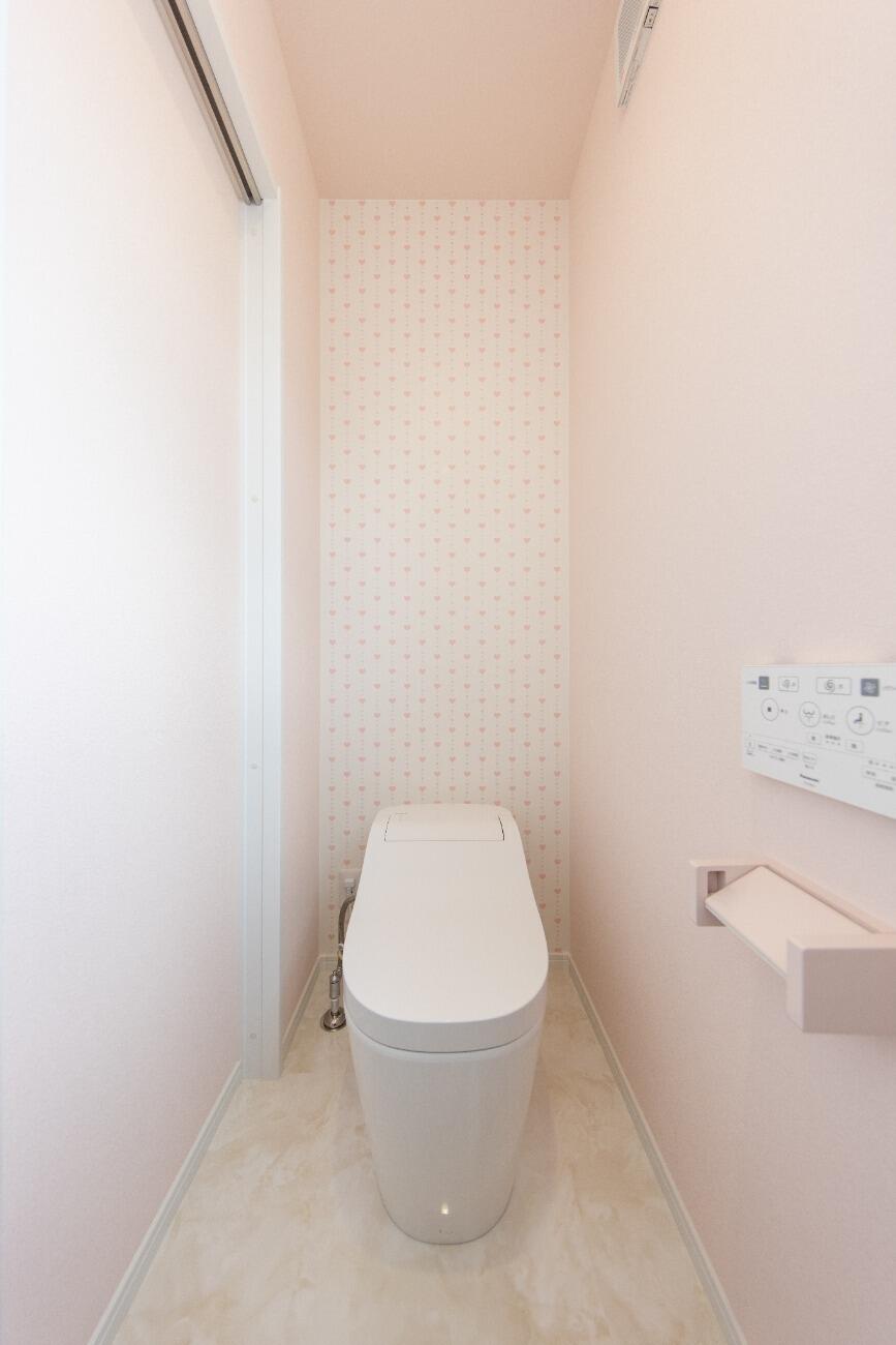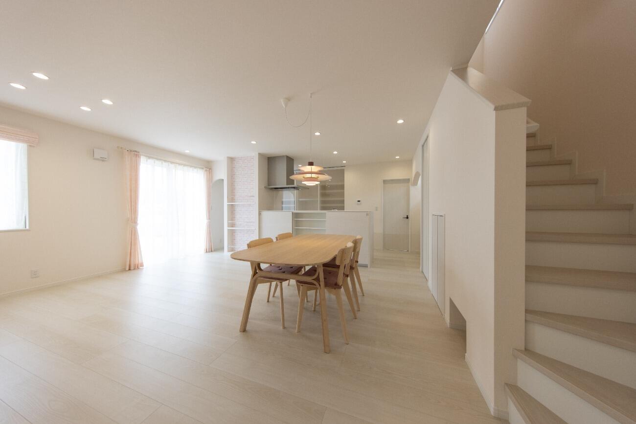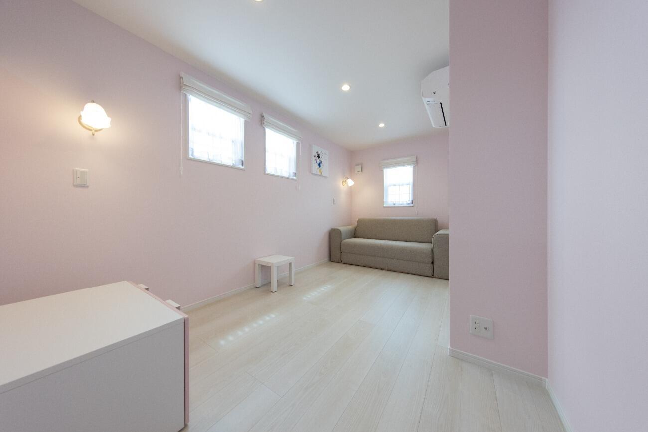 ホワイトでまとめたリビング。ところどころにかわいいピンクでアクセントを入れ、シンプルだけどかわいい、そんな空間ができあがりました。