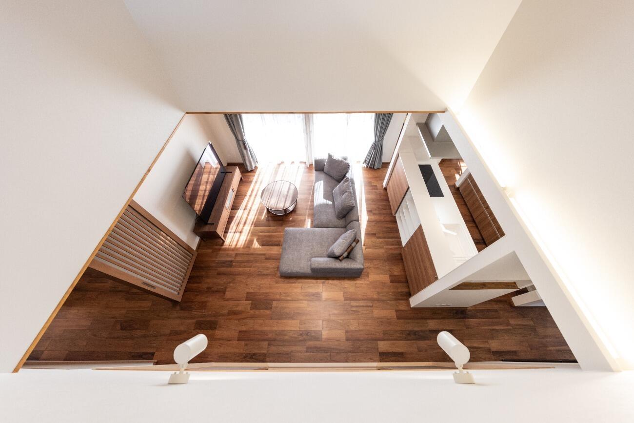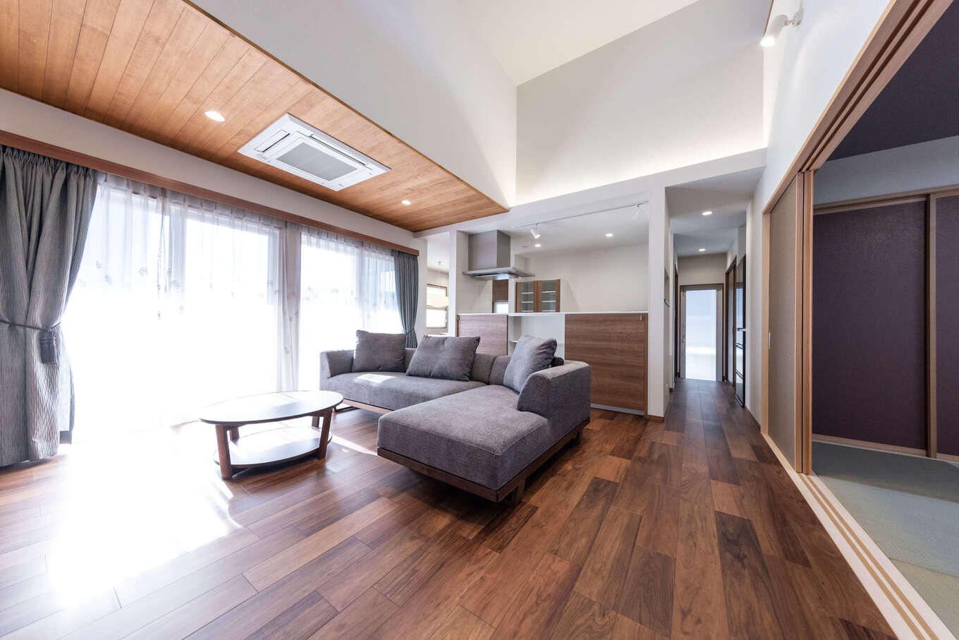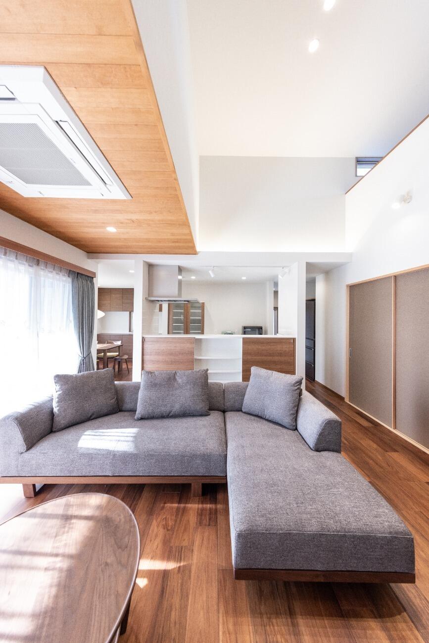 勾配天井を活かした吹抜け感覚のLDKは24畳の広さで、天井高は最大4.5m。ワタケンホームの代名詞ともいえるテクノストラクチャー工法により実現した、大空間・大開口リビングです。天井の一部にはレッドシダーを張って、エアコンをビルトインにしました。