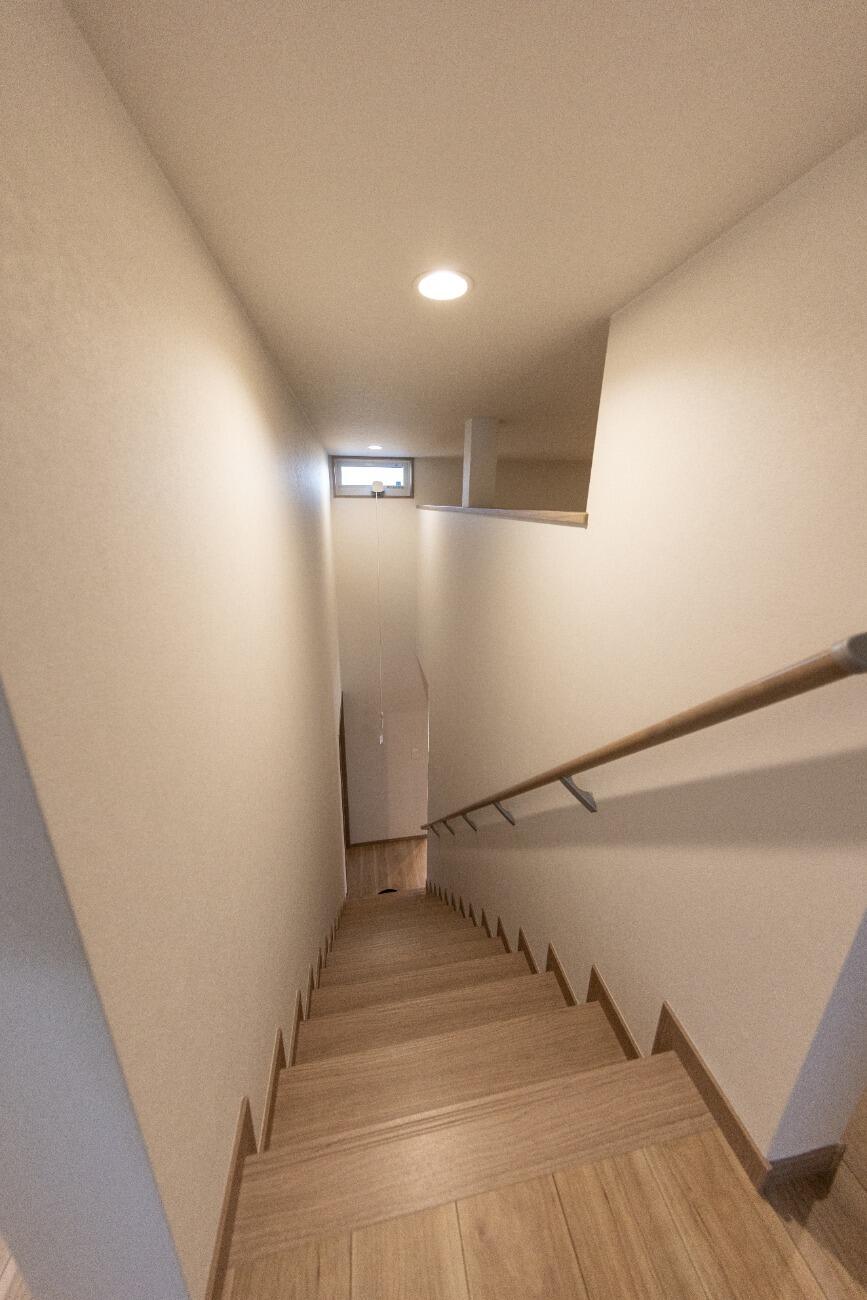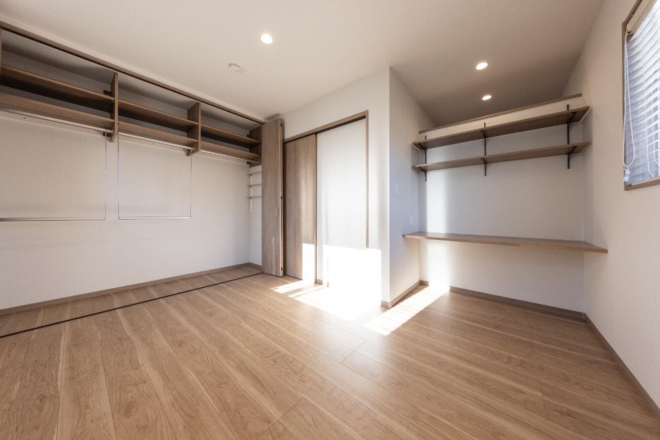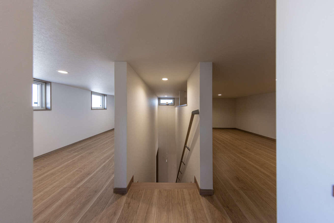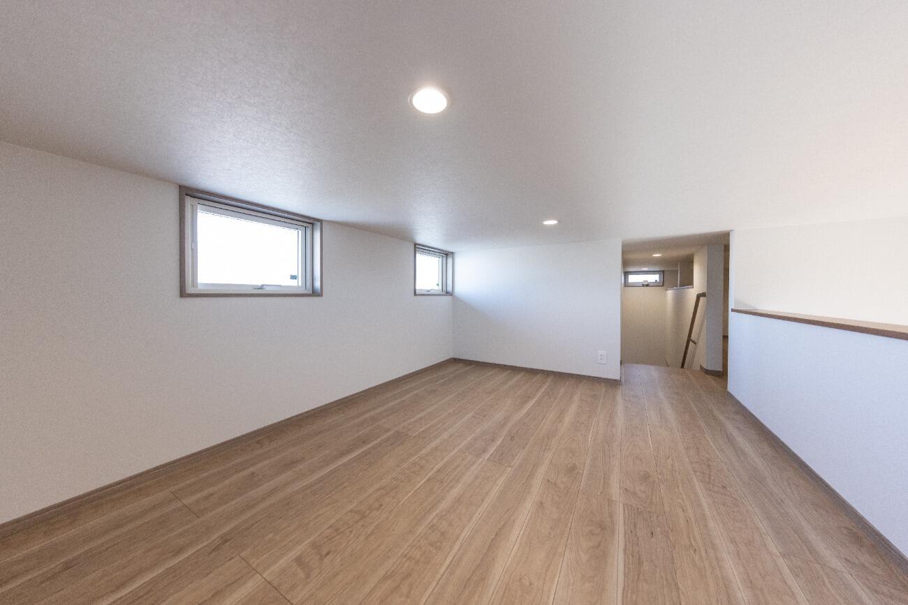 勾配天井を活かした吹抜け感覚のLDKは24畳の広さで、天井高は最大4.5m。ワタケンホームの代名詞ともいえるテクノストラクチャー工法により実現した、大空間・大開口リビングです。天井の一部にはレッドシダーを張って、エアコンをビルトインにしました。