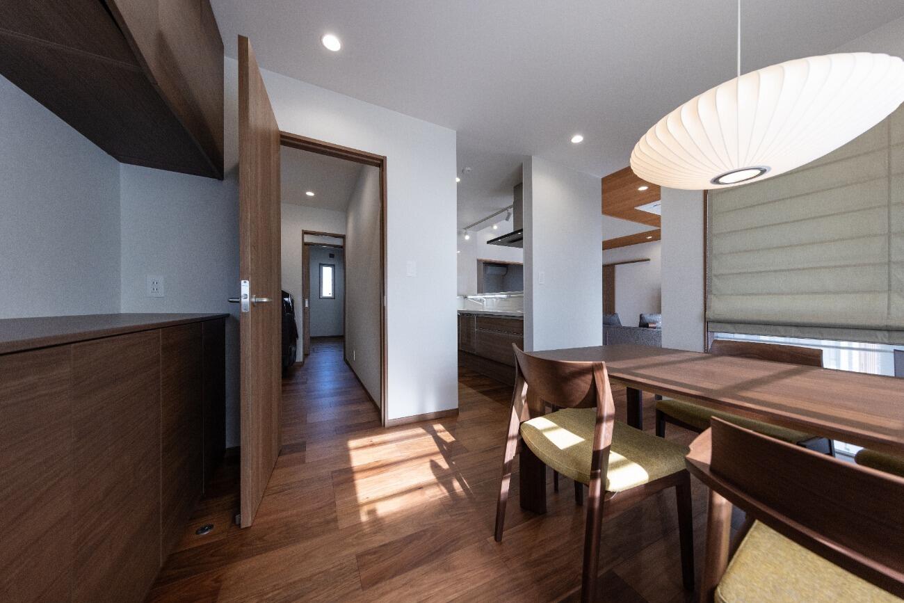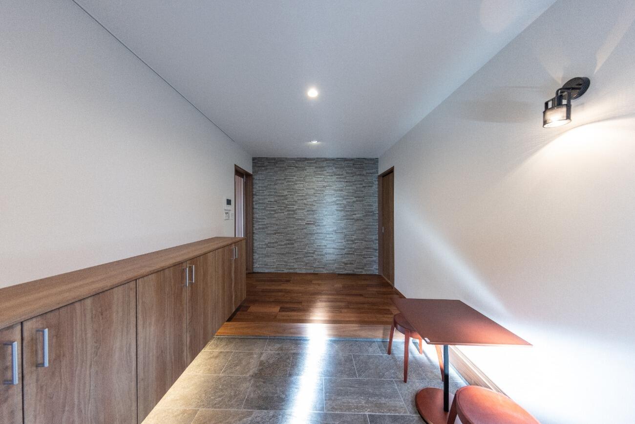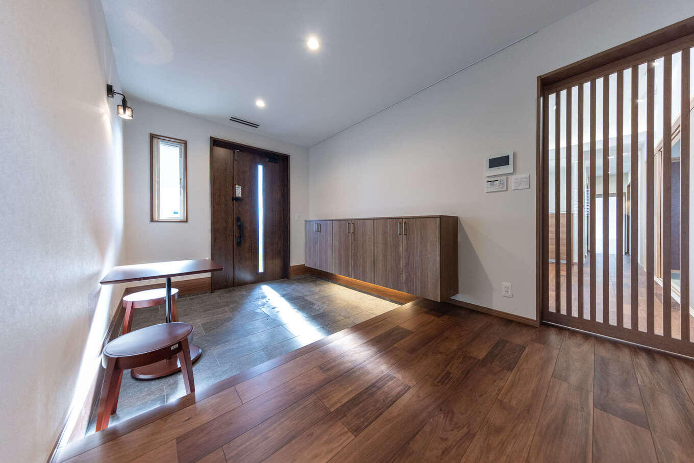 来客が多いため、玄関先でスムーズに対応できるようにと設計された7.5畳の空間。テーブルと椅子を置いても狭さを感じません。またリビングが丸見えにならないよう、格子の引き戸を採用し、下駄箱の下には間接照明を入れてニュアンスを出しました。