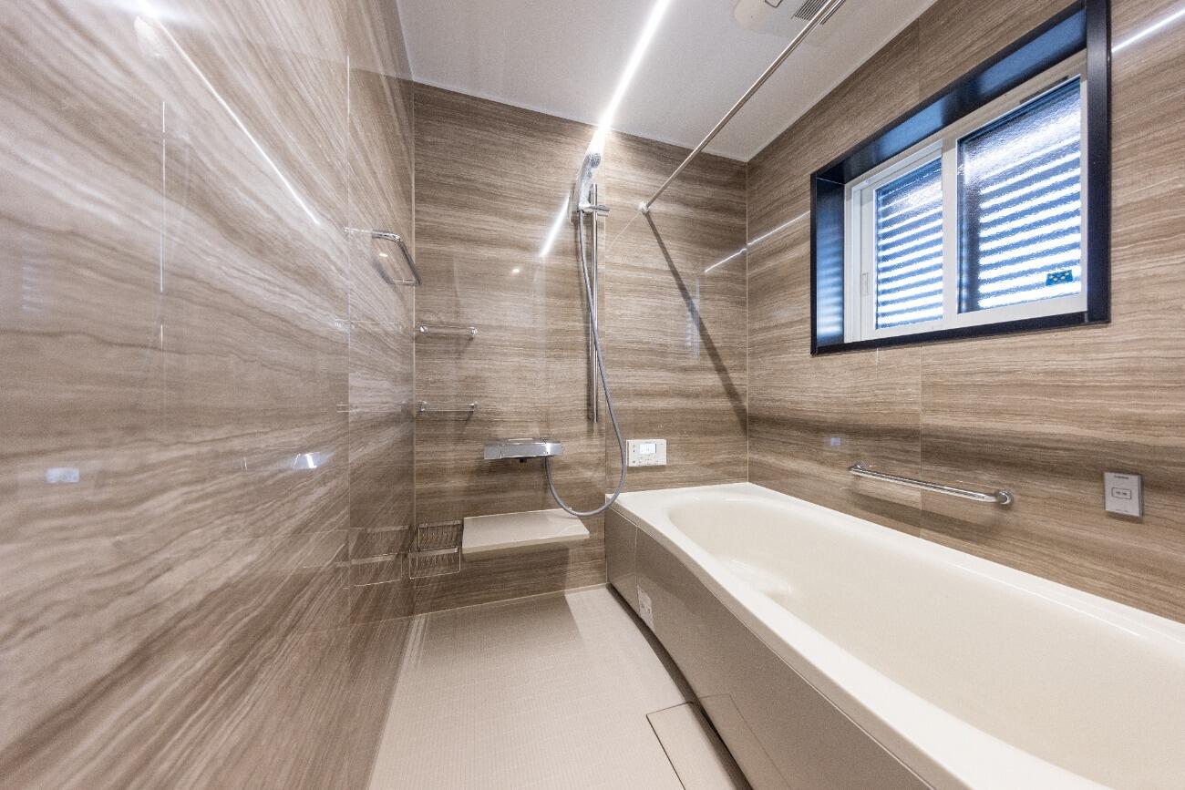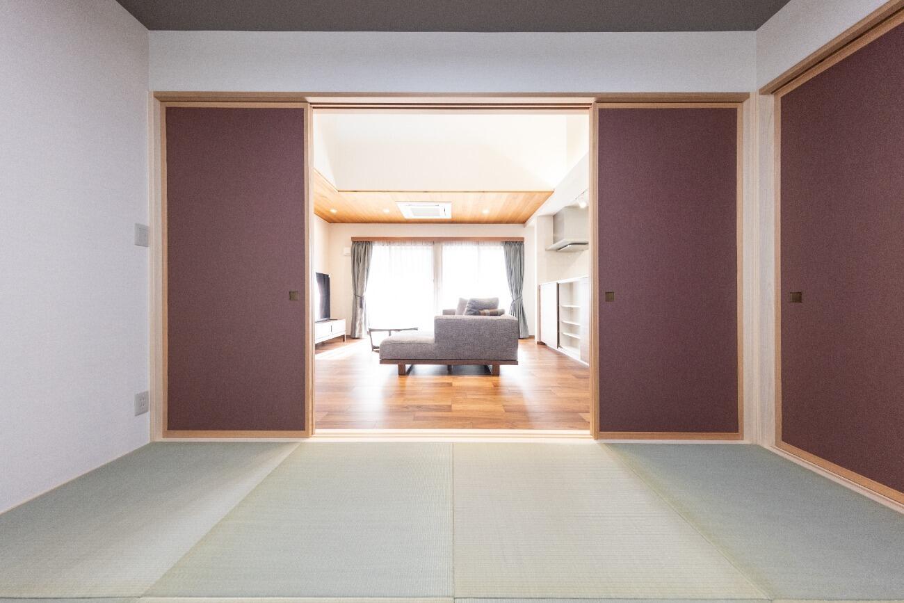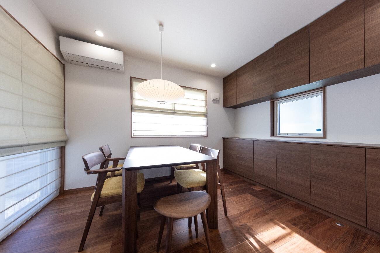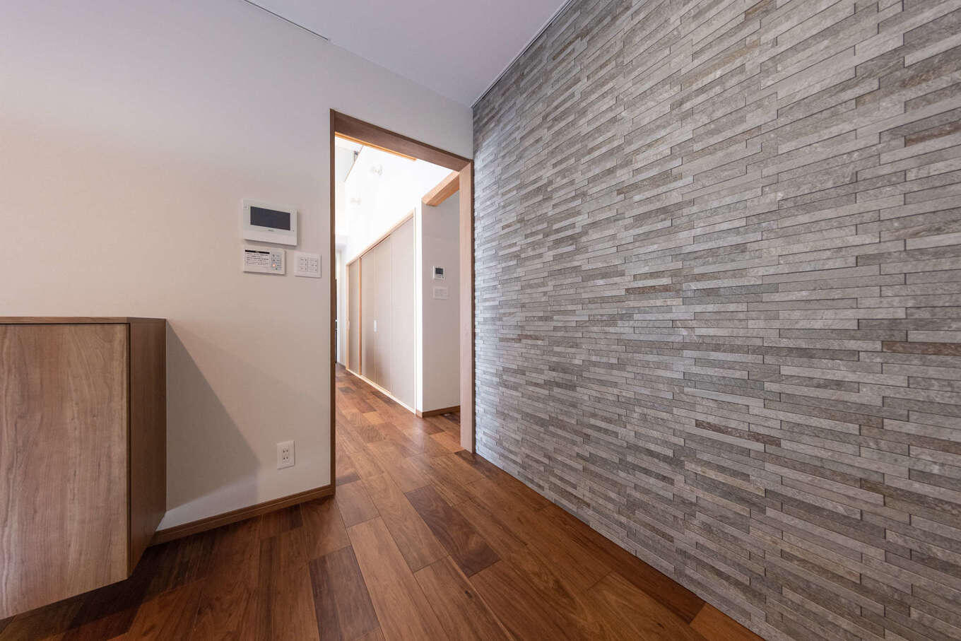 来客が多いため、玄関先でスムーズに対応できるようにと設計された7.5畳の空間。テーブルと椅子を置いても狭さを感じません。またリビングが丸見えにならないよう、格子の引き戸を採用し、下駄箱の下には間接照明を入れてニュアンスを出しました。