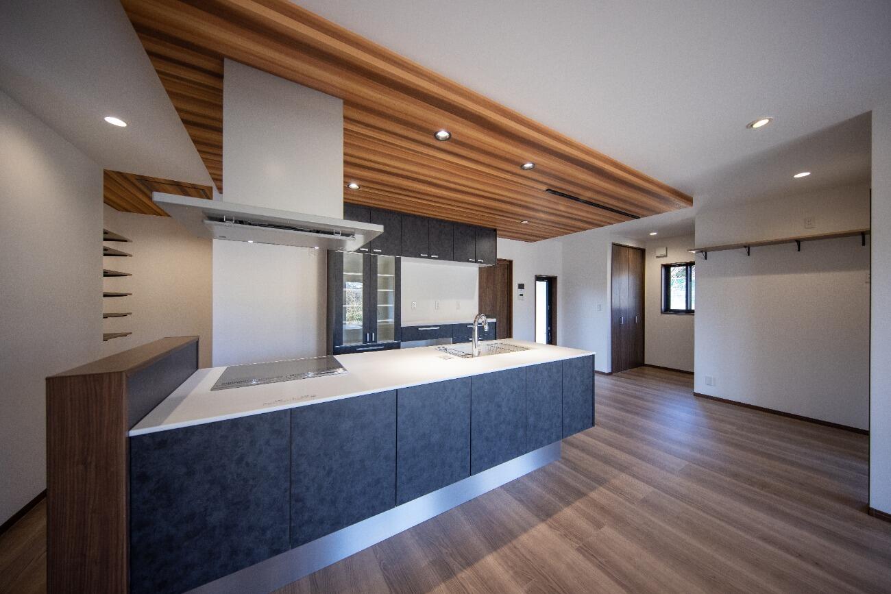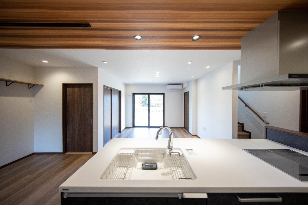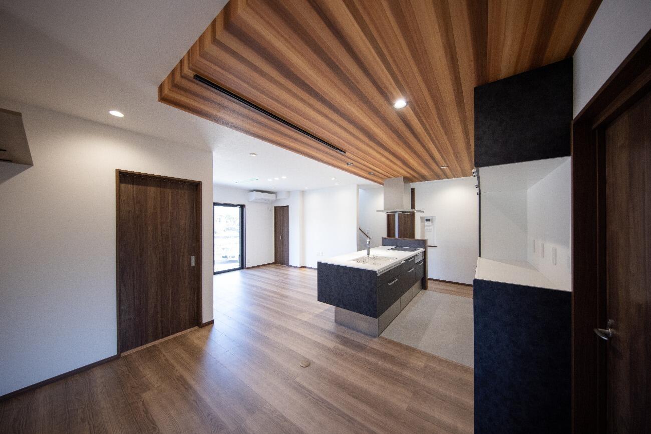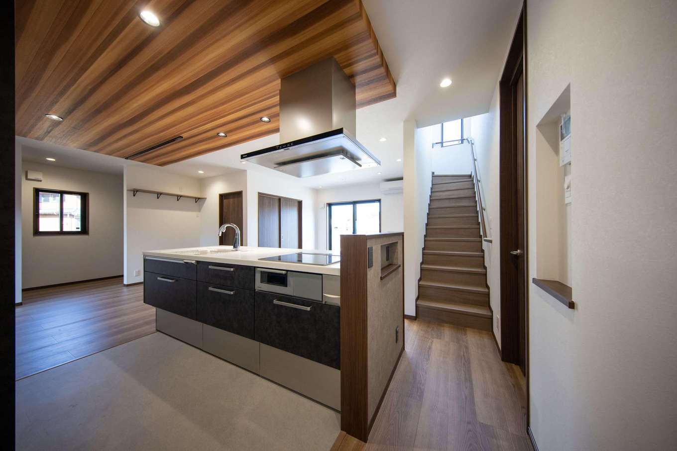 キッチンに木目調の下がり天井を採用し、アクセントをつけました。