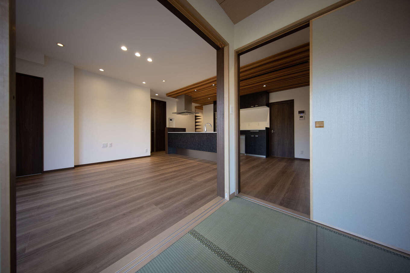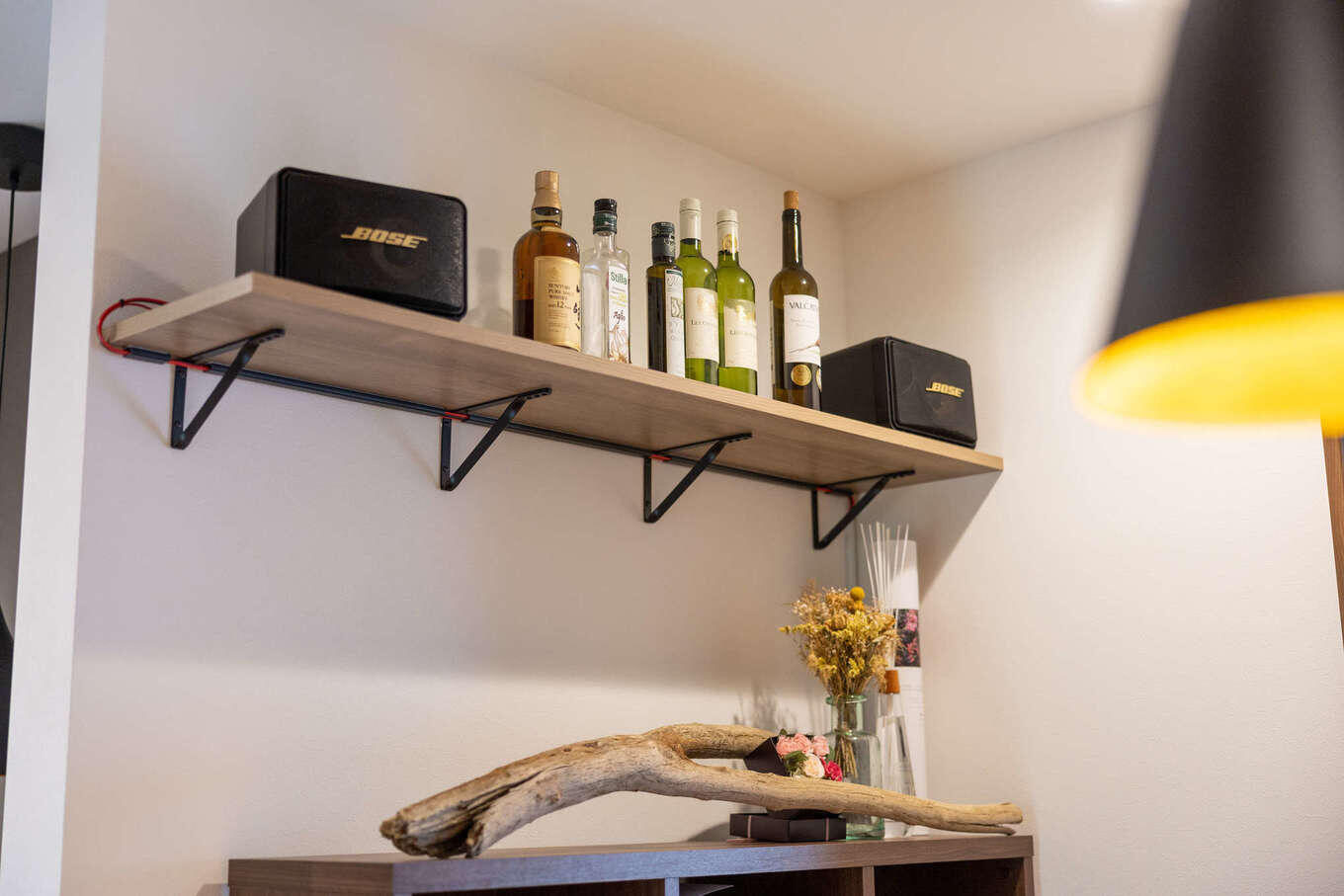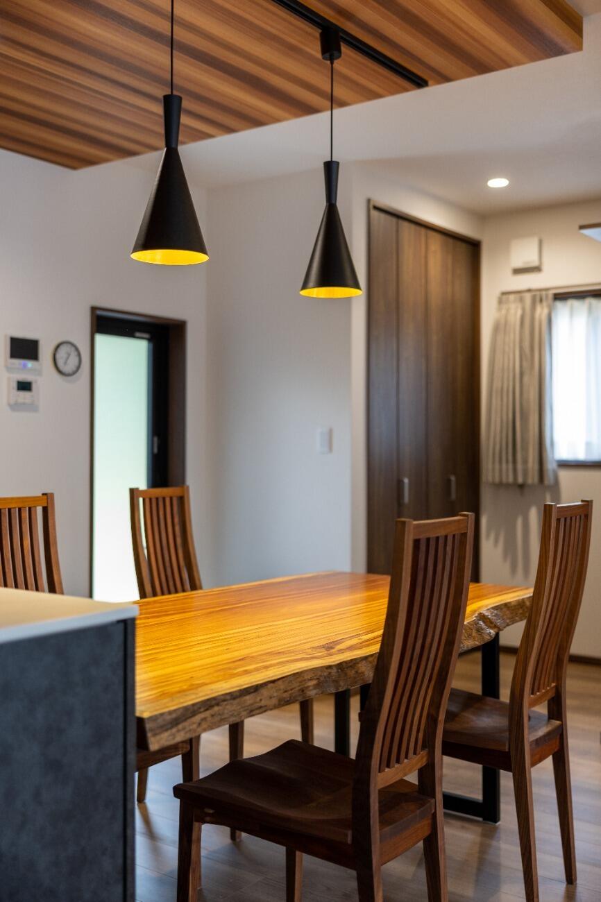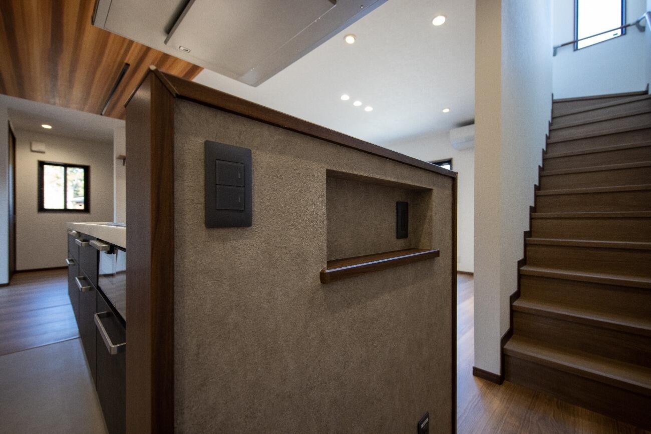 キッチンに木目調の下がり天井を採用し、アクセントをつけました。
