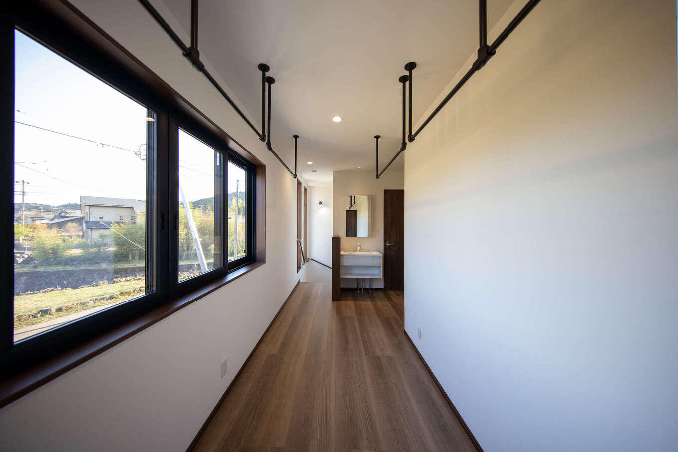 共働きなので、洗濯物は室内干しと決めて、スタイリッシュなデザインのアイアンのポールを2列設けました。